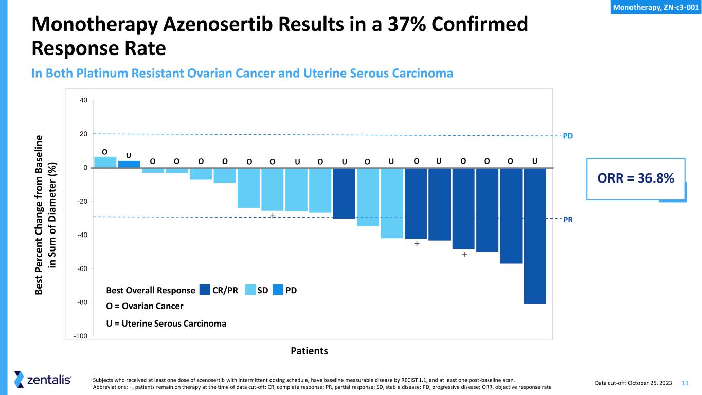 Established monotherapy RP2D of 400 mg 5:2 Median follow up has increased by nearly 5 months and mPFS has increased to 6.5 months 37% Objective Response Rate using intermittent dosing in ovarian and USC patients Maintained excellent safety and tolerability with intermittent dosing CORPORATE CALL June 6, 2023 Strong Safety and Tolerability of Azenosertib Monotherapy Abbreviations: USC, uterine serous carcinoma; RP2D: recommended Phase 2 dose; 5:2 refers to administration schedule of five days on therapy and two days off; mPFS, median progression free survival Longer Follow Up Improves Duration of Benefit Doubled steady state drug exposure compared to continuous dosing UPDATED DATA Nov 6, 2023 Monotherapy, ZN-c3-001
