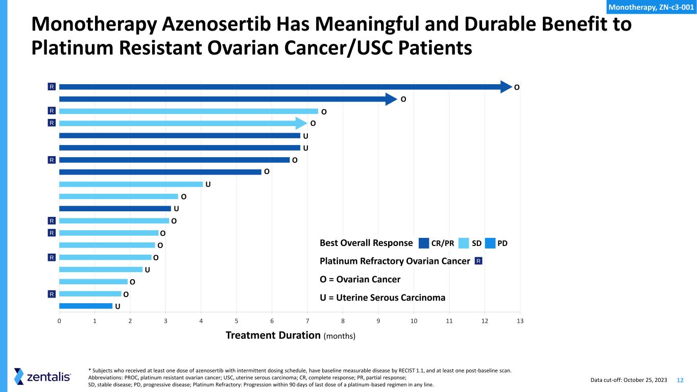 11 Subjects who received at least one dose of azenosertib with intermittent dosing schedule, have baseline measurable disease by RECIST 1.1, and at least one post-baseline scan. Abbreviations: +, patients remain on therapy at the time of data cut-off; CR, complete response; PR, partial response; SD, stable disease; PD, progressive disease; ORR, objective response rate Monotherapy Azenosertib Results in a 37% Confirmed Response Rate In Both Platinum Resistant Ovarian Cancer and Uterine Serous Carcinoma -100 -80 -60 -40 -20 0 20 40 B e st P e rc e n t C h an ge f ro m B as e lin e in S u m o f D ia m et e r (% ) Patients Best Overall Response CR/PR SD PD O = Ovarian Cancer U = Uterine Serous Carcinoma ORR = 36.8% PR PD + + + Data cut-off: October 25, 2023 Monotherapy, ZN-c3-001 O O U O O O O O U UO O U O U O O O U