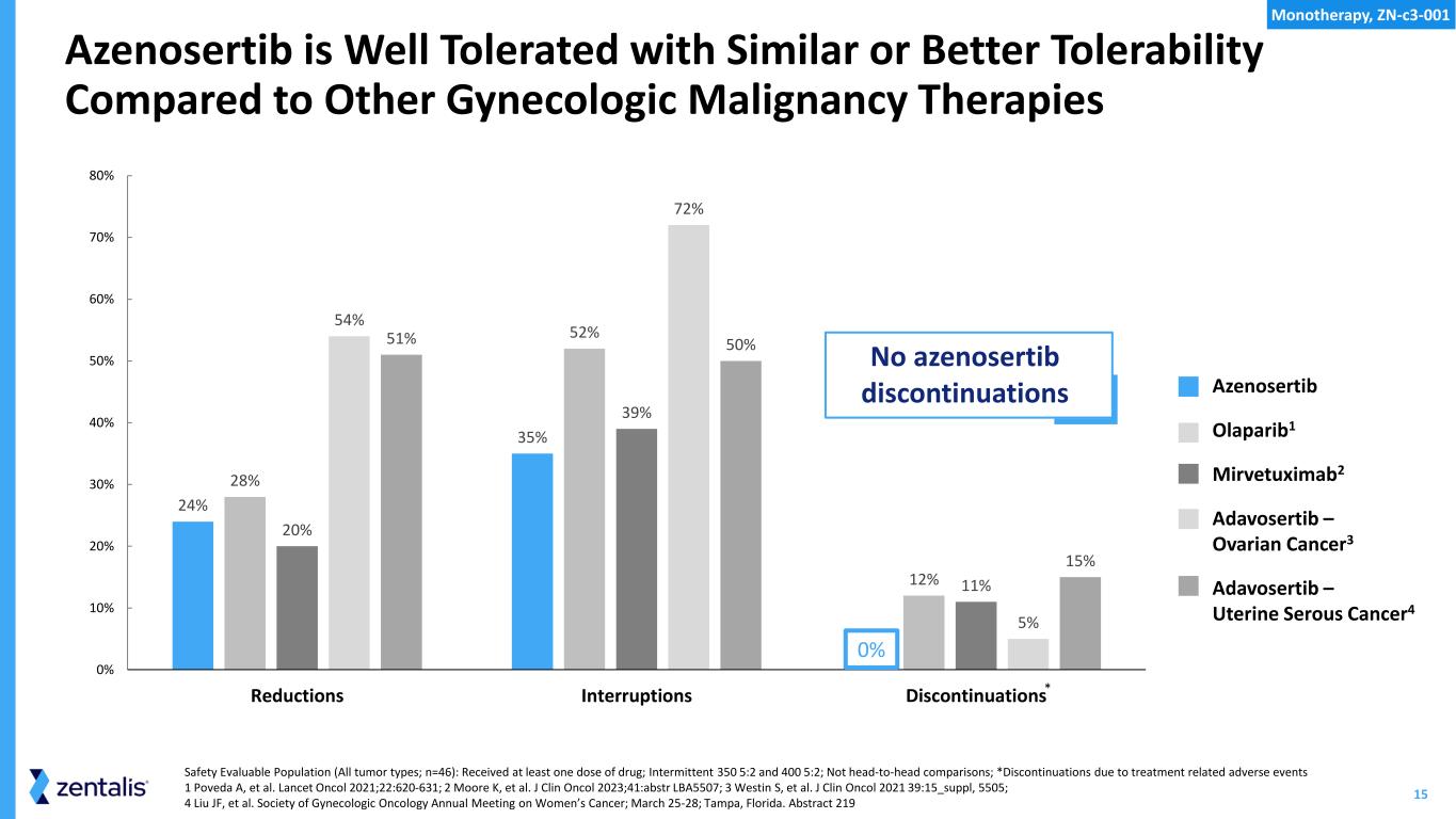 14 ALL GRADES GRADE 3/4 Fatigue 18 (39.1) 5 (10.9) Hematologic Anemia 11 (23.9) 5 (10.9) Thrombocytopenia 9 (19.6) 4 (8.7) Neutropenia 9 (19.6) 7 (15.2) ALL GRADES GRADE 3/4 Gastrointestinal Nausea 20 (43.5) 2 (4.3) Diarrhea 22 (47.8) 4 (8.7) Vomiting 8 (17.4) 1 (2.2) Decreased appetite 4 (8.7) 1 (2.2) Dehydration 5 (10.9) 0 Azenosertib Monotherapy Continues to Demonstrate Excellent Safety Profile with Additional Patients Across Tumor Types* *Safety Evaluable Population (All tumor types; n=46) as of Sept 27, 2023 versus n=27 reported on June 6, 2023 corporate call: Received at least one dose of drug; Intermittent 350 5:2 and 400 5:2; Treatment Related AEs > 10% for entire trial and treatment related AEs of interest. Abbreviations: AE, adverse event; 5:2, 5-days of treatment followed by 2-days off treatment Data cut-off: September 27, 2023 Treatment Related AEs, n (%) No cases of febrile neutropenia or sepsis Monotherapy, ZN-c3-001