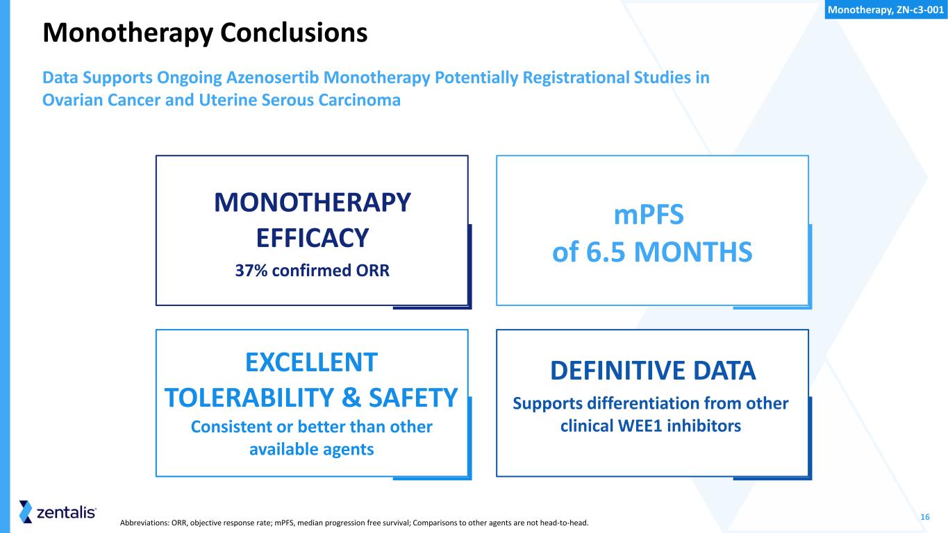 15 24% 35% 0% 28% 52% 12% 20% 39% 11% 54% 72% 5% 51% 50% 15% 0% 10% 20% 30% 40% 50% 60% 70% 80% Reductions Interruptions Discontinuations Azenosertib is Well Tolerated with Similar or Better Tolerability Compared to Other Gynecologic Malignancy Therapies Safety Evaluable Population (All tumor types; n=46): Received at least one dose of drug; Intermittent 350 5:2 and 400 5:2; Not head-to-head comparisons; *Discontinuations due to treatment related adverse events 1 Poveda A, et al. Lancet Oncol 2021;22:620-631; 2 Moore K, et al. J Clin Oncol 2023;41:abstr LBA5507; 3 Westin S, et al. J Clin Oncol 2021 39:15_suppl, 5505; 4 Liu JF, et al. Society of Gynecologic Oncology Annual Meeting on Women’s Cancer; March 25-28; Tampa, Florida. Abstract 219 No azenosertib discontinuations Azenosertib Olaparib1 Mirvetuximab2 Adavosertib – Ovarian Cancer3 Adavosertib – Uterine Serous Cancer4 0 * Monotherapy, ZN-c3-001