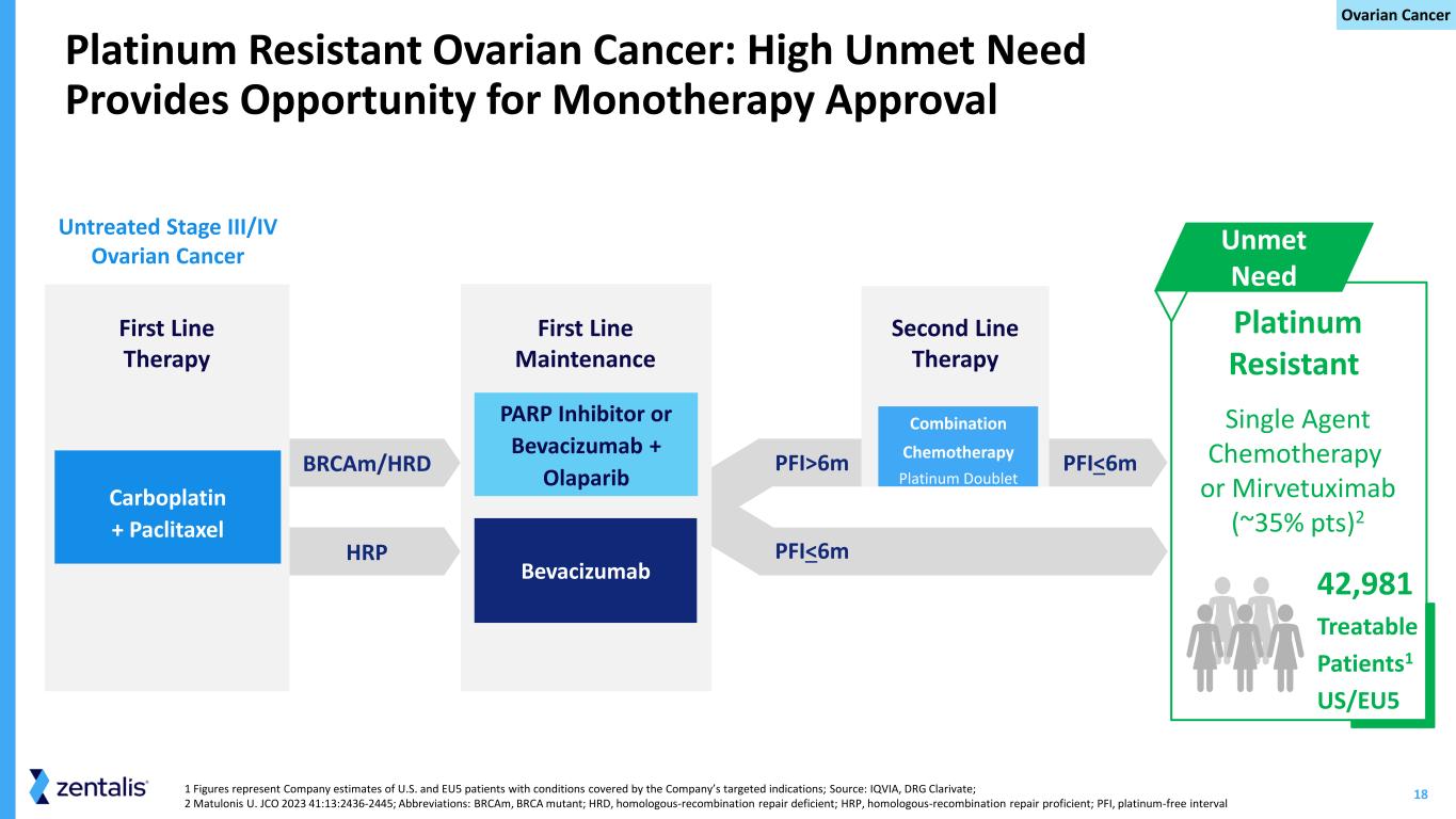 PFI<6m Second Line Therapy Combination Chemotherapy Platinum Doublet PFI>6m PFI<6m Platinum Resistant Single Agent Chemotherapy or Mirvetuximab (~35% pts)3 Opportunity for Azenosertib in First Line Maintenance in Homologous Repair Proficient (HRP) Platinum Sensitive Ovarian Cancer 1 Ray-Coquard I. N Engl J Med 2019; December 2019 381:2416-2428; 2 Figures represent Company estimates of U.S. and EU5 patients with conditions covered by the Company’s targeted indications; Source: IQVIA, DRG Clarivate; 3 Matulonis U. JCO 2023 41:13:2436-2445; Abbreviations: BRCAm, BRCA mutant; HRD, homologous-recombination repair deficient; HRP, homologous-recombination repair proficient; PFI, platinum-free interval Untreated Stage III/IV Ovarian Cancer Carboplatin + Paclitaxel First Line Maintenance PARP Inhibitor or Bevacizumab + Olaparib Bevacizumab BRCAm/HRD HRP Ovarian Cancer First Line Therapy 20,905 Treatable Patients2 US/EU5 ~40% patients are HRP/not eligible for maintenance PARP1 Unmet Need Platinum Sensitive