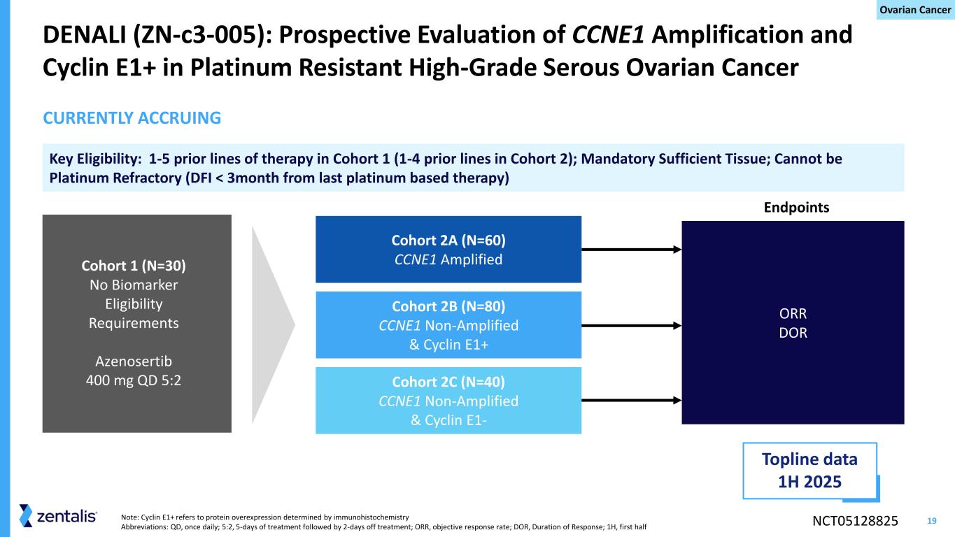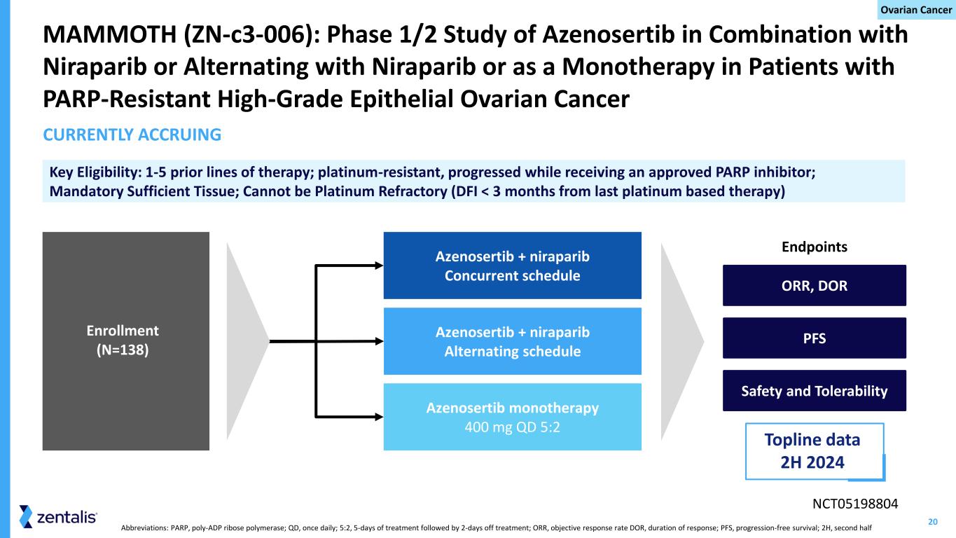 19Note: Cyclin E1+ refers to protein overexpression determined by immunohistochemistry Abbreviations: QD, once daily; 5:2, 5-days of treatment followed by 2-days off treatment; ORR, objective response rate; DOR, Duration of Response; 1H, first half DENALI (ZN-c3-005): Prospective Evaluation of CCNE1 Amplification and Cyclin E1+ in Platinum Resistant High-Grade Serous Ovarian Cancer Endpoints Cohort 2B (N=80) CCNE1 Non-Amplified & Cyclin E1+ Cohort 2C (N=40) CCNE1 Non-Amplified & Cyclin E1- Cohort 2A (N=60) CCNE1 Amplified NCT05128825 Cohort 1 (N=30) No Biomarker Eligibility Requirements Azenosertib 400 mg QD 5:2 Key Eligibility: 1-5 prior lines of therapy in Cohort 1 (1-4 prior lines in Cohort 2); Mandatory Sufficient Tissue; Cannot be Platinum Refractory (DFI < 3month from last platinum based therapy) CURRENTLY ACCRUING ORR DOR Topline data 1H 2025 Ovarian Cancer