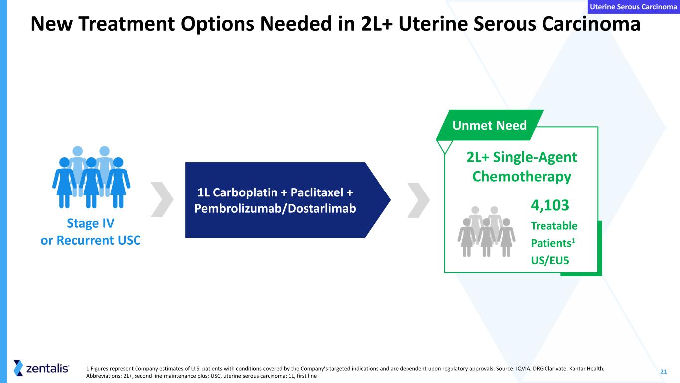 211 Figures represent Company estimates of U.S. patients with conditions covered by the Company’s targeted indications and are dependent upon regulatory approvals; Source: IQVIA, DRG Clarivate, Kantar Health; Abbreviations: 2L+, second line maintenance plus; USC, uterine serous carcinoma; 1L, first line New Treatment Options Needed in 2L+ Uterine Serous Carcinoma Stage IV or Recurrent USC 2L+ Single-Agent Chemotherapy 4,103 Treatable Patients1 US/EU5 Unmet Need 1L Carboplatin + Paclitaxel + Pembrolizumab/Dostarlimab Uterine Serous Carcinoma