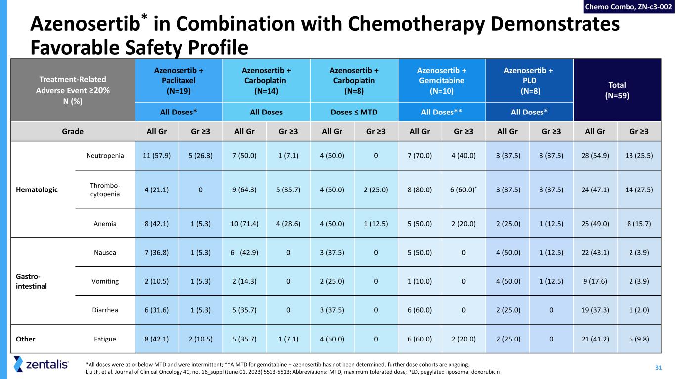 30 *Response-evaluable subjects are treated subjects with baseline measurable disease per RECIST version 1.1 and at least one post-baseline assessment. All objective responses were confirmed per RECIST v 1.1. Data include patients on all schedules of azenosertib plus chemotherapy. Liu JF, et al. Journal of Clinical Oncology 41, no. 16_suppl (June 01, 2023) 5513-5513; Abbreviations: PLD, pegylated liposomal doxorubicin; ORR, objective response rate; DOR, duration of response; CI, confidence interval; NE, not estimable; CR, complete response; PR, partial response; SD, stable disease; PFS, progression-free survival; RECIST, response evaluation criteria in solid tumors Encouraging Efficacy and Durability with Azenosertib* in Combination with Chemotherapy in Platinum Resistant Ovarian Cancer Endpoint Azenosertib + Paclitaxel (N=26) Azenosertib + Carboplatin (N=36) Azenosertib + Gemcitabine (N=18) Azenosertib + PLD (N=35) Total (N=115) Response-Evaluable* (N) 22 28 13 31 94 ORR (confirmed), N (%) 11 (50.0) 10 (35.7) 5 (38.5) 6 (19.4) 32 (34.0) Median DOR (95% CI) in months 5.6 (3.8-NE) 11.4 (8.3-NE) 6.2 (NE) 7.3 (1.5-NE) 8.3 (5.6-12.4) Clinical Benefit Rate (CR + PR + SD for ≥ 16 weeks), N (%) 18 (81.8) 16 (57.1) 6 (46.2) 24 (77.4) 64 (68.1) Median PFS (95% CI) in months 7.4 (5.5-NE) 10.4 (3.3-14.5) 8.3 (3.3-NE) 6.3 (3.7-11.0) 9.0 (5.8-13.7) Chemo Combo, ZN-c3-002 Data cut-off: April 10, 2023