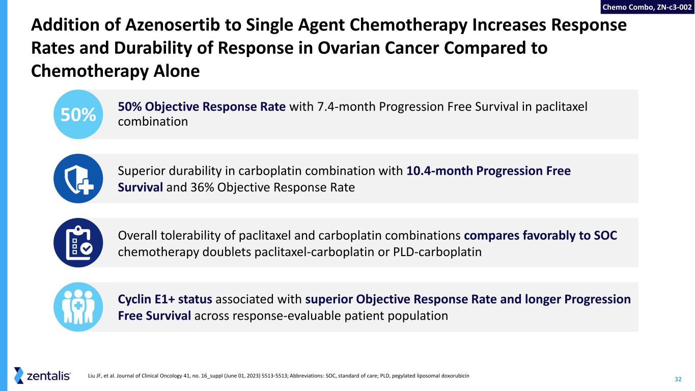 31*All doses were at or below MTD and were intermittent; **A MTD for gemcitabine + azenosertib has not been determined, further dose cohorts are ongoing. Liu JF, et al. Journal of Clinical Oncology 41, no. 16_suppl (June 01, 2023) 5513-5513; Abbreviations: MTD, maximum tolerated dose; PLD, pegylated liposomal doxorubicin Azenosertib* in Combination with Chemotherapy Demonstrates Favorable Safety Profile Treatment-Related Adverse Event ≥20% N (%) Azenosertib + Paclitaxel (N=19) Azenosertib + Carboplatin (N=14) Azenosertib + Carboplatin (N=8) Azenosertib + Gemcitabine (N=10) Azenosertib + PLD (N=8) Total (N=59) All Doses* All Doses Doses ≤ MTD All Doses** All Doses* Grade All Gr Gr ≥3 All Gr Gr ≥3 All Gr Gr ≥3 All Gr Gr ≥3 All Gr Gr ≥3 All Gr Gr ≥3 Hematologic Neutropenia 11 (57.9) 5 (26.3) 7 (50.0) 1 (7.1) 4 (50.0) 0 7 (70.0) 4 (40.0) 3 (37.5) 3 (37.5) 28 (54.9) 13 (25.5) Thrombo- cytopenia 4 (21.1) 0 9 (64.3) 5 (35.7) 4 (50.0) 2 (25.0) 8 (80.0) 6 (60.0)* 3 (37.5) 3 (37.5) 24 (47.1) 14 (27.5) Anemia 8 (42.1) 1 (5.3) 10 (71.4) 4 (28.6) 4 (50.0) 1 (12.5) 5 (50.0) 2 (20.0) 2 (25.0) 1 (12.5) 25 (49.0) 8 (15.7) Gastro- intestinal Nausea 7 (36.8) 1 (5.3) 6 (42.9) 0 3 (37.5) 0 5 (50.0) 0 4 (50.0) 1 (12.5) 22 (43.1) 2 (3.9) Vomiting 2 (10.5) 1 (5.3) 2 (14.3) 0 2 (25.0) 0 1 (10.0) 0 4 (50.0) 1 (12.5) 9 (17.6) 2 (3.9) Diarrhea 6 (31.6) 1 (5.3) 5 (35.7) 0 3 (37.5) 0 6 (60.0) 0 2 (25.0) 0 19 (37.3) 1 (2.0) Other Fatigue 8 (42.1) 2 (10.5) 5 (35.7) 1 (7.1) 4 (50.0) 0 6 (60.0) 2 (20.0) 2 (25.0) 0 21 (41.2) 5 (9.8) Chemo Combo, ZN-c3-002