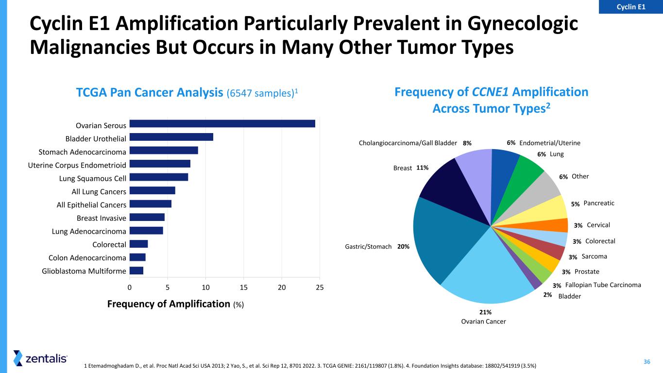 381 Stronach, et al. Mol Cancer Res 2018;16:1103-11; 2 Pils, et al. Eur J Cancer 2014;50:99-110; 3 Peterson, et al. Gynecol Oncol 2020;157:405-10; 3 Nakayama, et al. Cancer 2010;116:2621-34; 5 Kang, et al. Cancer 2023;129:697-713; 6 Chan, et al. J Pathol Clin Res 2020;6:252-62; *Timing of tissue collection was not disclosed. Abbreviations: PFS: progression free survival, OS; overall survival Ovarian Cancer Patients with CCNE1 Amplified and/or Cyclin E1+ Cancers Have a Worse Outcome Following Platinum-Based Chemotherapy Treatment Independent of Platinum-Sensitivity Status 6 Studies; n=5,404 • 4 studies where timing of tissue collection was available- all were platinum sensitive tissue collected after ≤ 1 course of chemotherapy; 3,533/5,404 (65%) • Other 2 studies did not disclose timing of tissue collection 1 2 4 53 Chan (2020) [OS] Kang (2023) [OS] Nakayama (2010) [OS] Petersen (2020) [OS] Petersen (2020) [PFS] Pils (2014) [OS] Stronach (2018) [OS] Stronach (2018) [PFS] Hazard Ratio N 100 500 1000 Cyclin E1 Alteration Amplification Amplification+ Overexpression PF 1 O 1 O 2 PF 3 O 3 O 4 O 5 O 6 Hazard Ratio WORSE OUTCOME CCNE1 Alteration Type Amplification Amplification + Overexpression N 100 500 1000 Cyclin E1