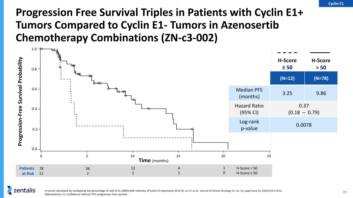 39H-scores calculated by multiplying the percentage of cells (0 to 100%) with intensity of Cyclin E1 expression (0 to 3); Liu JF., et al. Journal of Clinical Oncology 41, no. 16_suppl (June 01, 2023) 5513-5513; Abbreviations: CI, confidence interval; PFS, progression free survival Progression Free Survival Triples in Patients with Cyclin E1+ Tumors Compared to Cyclin E1- Tumors in Azenosertib Chemotherapy Combinations (ZN-c3-002) 0 0.0 0.2 0.4 0.6 0.8 1.0 5 10 15 20 25 P ro gr e ss io n -F re e Su rv iv al P ro b ab ili ty Time (months) Patients at Risk 78 12 36 2 12 1 4 1 1 0 H-Score > 50 H-Score ≤ 50 (N=12) (N=78) Median PFS (months) 3.25 9.86 Hazard Ratio (95% CI) 0.37 (0.18 – 0.79) Log-rank p-value 0.0078 H-Score ≤ 50 H-Score > 50 Cyclin E1