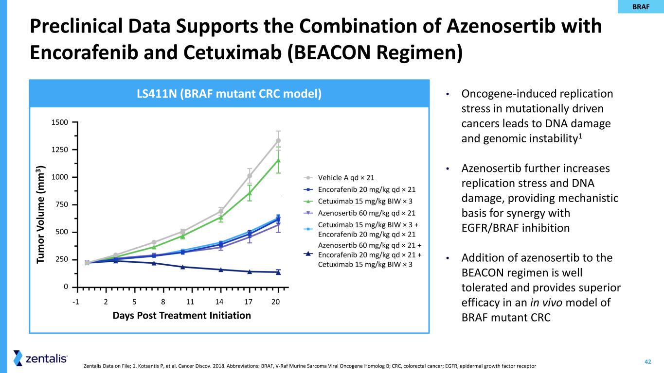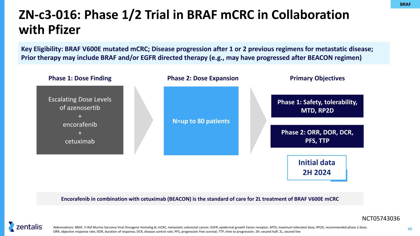 42 • Oncogene-induced replication stress in mutationally driven cancers leads to DNA damage and genomic instability1 • Azenosertib further increases replication stress and DNA damage, providing mechanistic basis for synergy with EGFR/BRAF inhibition • Addition of azenosertib to the BEACON regimen is well tolerated and provides superior efficacy in an in vivo model of BRAF mutant CRC Preclinical Data Supports the Combination of Azenosertib with Encorafenib and Cetuximab (BEACON Regimen) LS411N (BRAF mutant CRC model) Zentalis Data on File; 1. Kotsantis P, et al. Cancer Discov. 2018. Abbreviations: BRAF, V-Raf Murine Sarcoma Viral Oncogene Homolog B; CRC, colorectal cancer; EGFR, epidermal growth factor receptor Tu m o r V o lu m e ( m m 3 ) Days Post Treatment Initiation 1500 1250 1000 750 500 250 0 -1 2 5 8 11 14 17 20 BRAF
