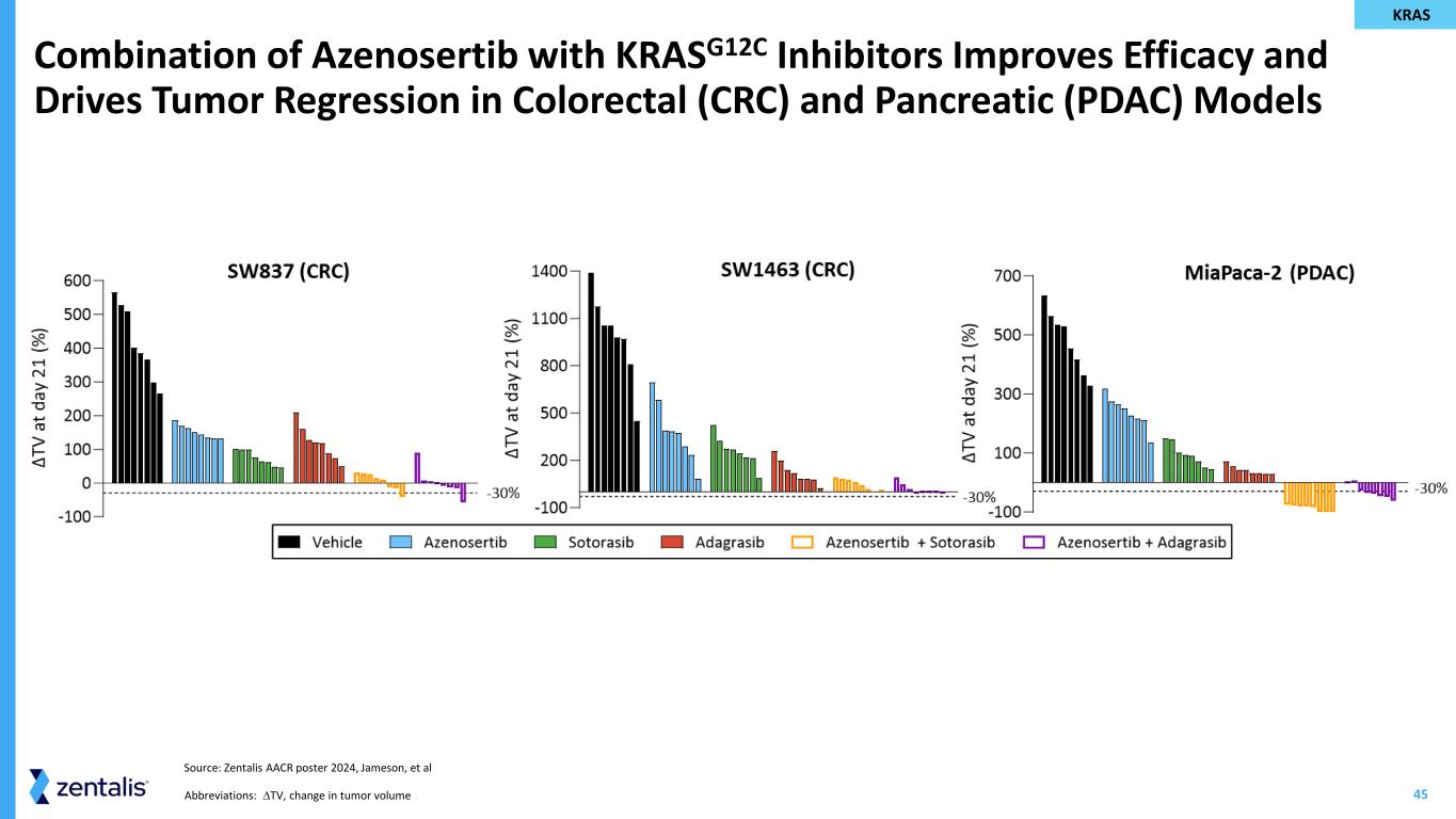 45 Combination of Azenosertib with KRASG12C Inhibitors Improves Efficacy and Drives Tumor Regression in Colorectal (CRC) and Pancreatic (PDAC) Models Source: Zentalis AACR poster 2024, Jameson, et al KRAS Abbreviations: DTV, change in tumor volume