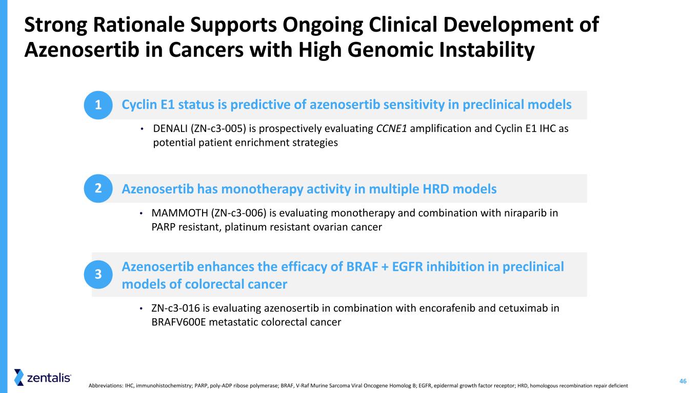 46 3 2 1 Abbreviations: IHC, immunohistochemistry; PARP, poly-ADP ribose polymerase; BRAF, V-Raf Murine Sarcoma Viral Oncogene Homolog B; EGFR, epidermal growth factor receptor; HRD, homologous recombination repair deficient Strong Rationale Supports Ongoing Clinical Development of Azenosertib in Cancers with High Genomic Instability Cyclin E1 status is predictive of azenosertib sensitivity in preclinical models • DENALI (ZN-c3-005) is prospectively evaluating CCNE1 amplification and Cyclin E1 IHC as potential patient enrichment strategies Azenosertib has monotherapy activity in multiple HRD models • MAMMOTH (ZN-c3-006) is evaluating monotherapy and combination with niraparib in PARP resistant, platinum resistant ovarian cancer Azenosertib enhances the efficacy of BRAF + EGFR inhibition in preclinical models of colorectal cancer • ZN-c3-016 is evaluating azenosertib in combination with encorafenib and cetuximab in BRAFV600E metastatic colorectal cancer
