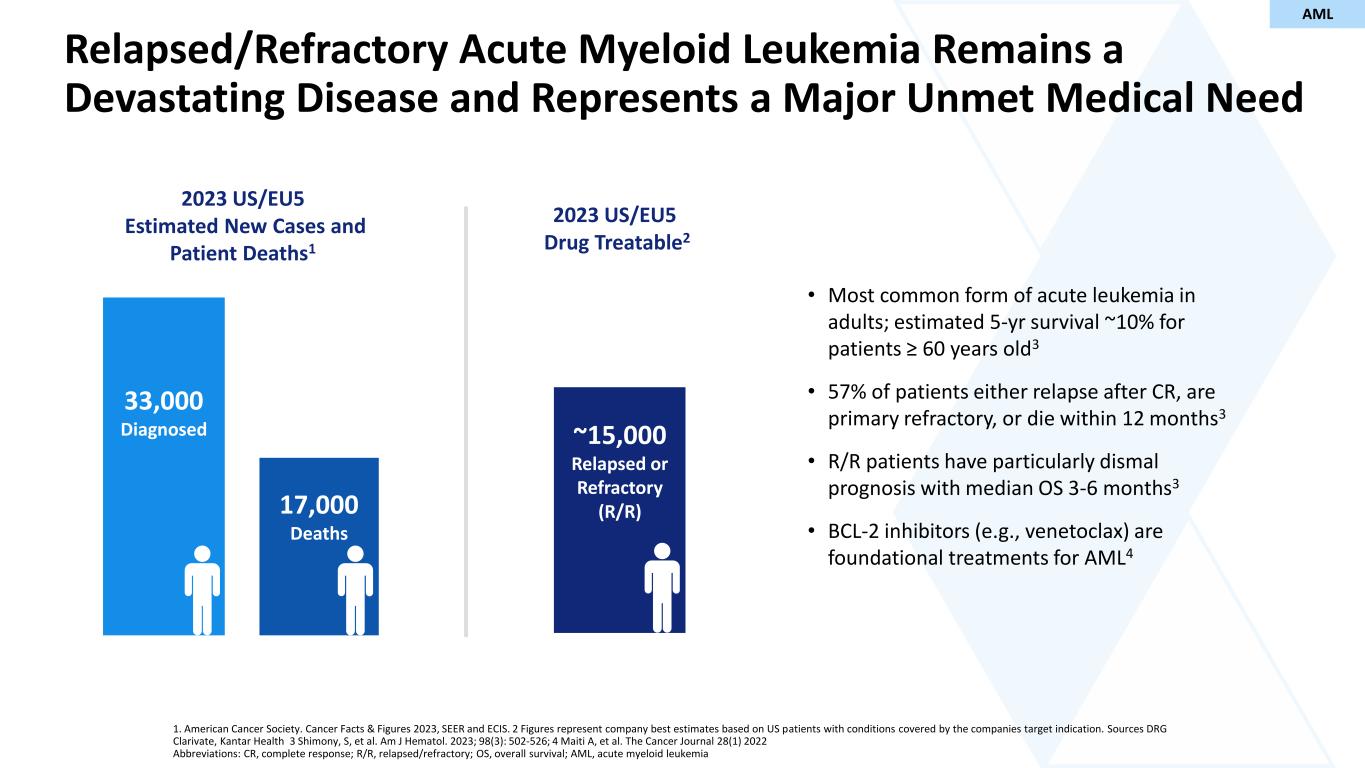 1. American Cancer Society. Cancer Facts & Figures 2023, SEER and ECIS. 2 Figures represent company best estimates based on US patients with conditions covered by the companies target indication. Sources DRG Clarivate, Kantar Health 3 Shimony, S, et al. Am J Hematol. 2023; 98(3): 502-526; 4 Maiti A, et al. The Cancer Journal 28(1) 2022 Abbreviations: CR, complete response; R/R, relapsed/refractory; OS, overall survival; AML, acute myeloid leukemia Relapsed/Refractory Acute Myeloid Leukemia Remains a Devastating Disease and Represents a Major Unmet Medical Need • Most common form of acute leukemia in adults; estimated 5-yr survival ~10% for patients ≥ 60 years old3 • 57% of patients either relapse after CR, are primary refractory, or die within 12 months3 • R/R patients have particularly dismal prognosis with median OS 3-6 months3 • BCL-2 inhibitors (e.g., venetoclax) are foundational treatments for AML4 33,000 Diagnosed 17,000 Deaths ~15,000 Relapsed or Refractory (R/R) 2023 US/EU5 Estimated New Cases and Patient Deaths1 2023 US/EU5 Drug Treatable2 AML