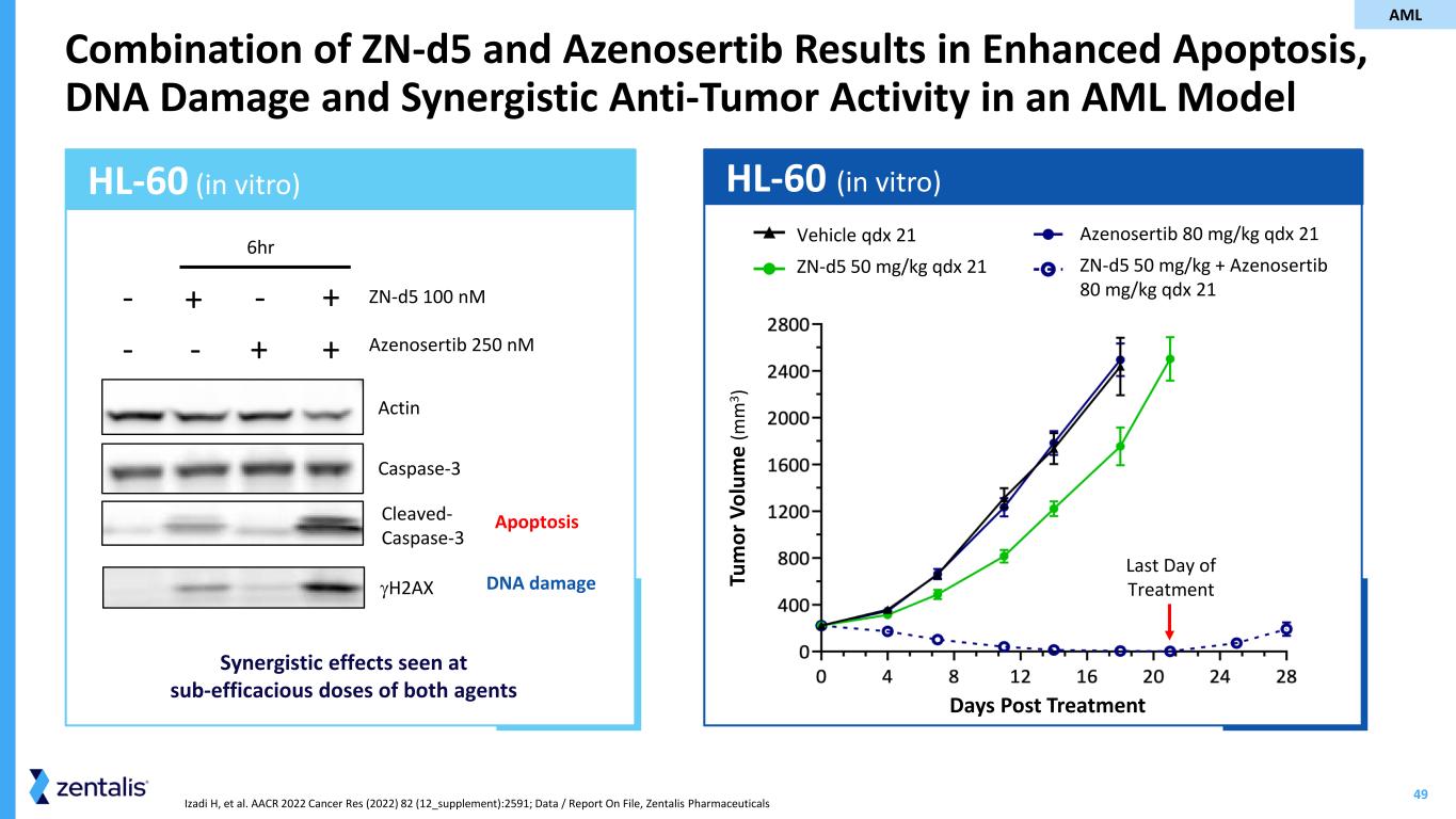 49 HL-60 (in vitro)HL-60 (in vitro) Izadi H, et al. AACR 2022 Cancer Res (2022) 82 (12_supplement):2591; Data / Report On File, Zentalis Pharmaceuticals Combination of ZN-d5 and Azenosertib Results in Enhanced Apoptosis, DNA Damage and Synergistic Anti-Tumor Activity in an AML Model - - + - + - + + 6hr Cleaved- Caspase-3 ZN-d5 100 nM Azenosertib 250 nM Caspase-3 Actin gH2AX Apoptosis DNA damage Synergistic effects seen at sub-efficacious doses of both agents Days Post Treatment Tu m o r V o lu m e (m m 3 ) Vehicle qdx 21 ZN-d5 50 mg/kg qdx 21 Azenosertib 80 mg/kg qdx 21 ZN-d5 50 mg/kg + Azenosertib 80 mg/kg qdx 21 Last Day of Treatment AML