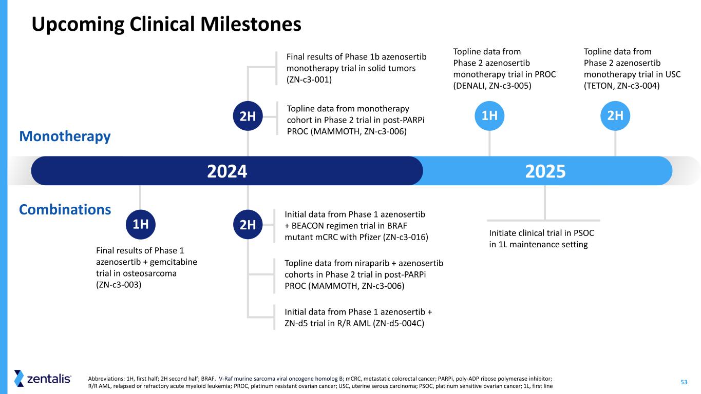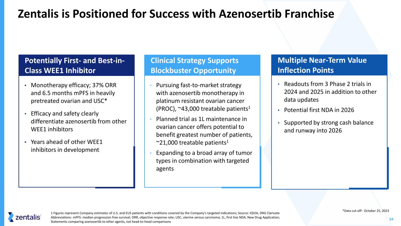 53 Initial data from Phase 1 azenosertib + BEACON regimen trial in BRAF mutant mCRC with Pfizer (ZN-c3-016) Topline data from niraparib + azenosertib cohorts in Phase 2 trial in post-PARPi PROC (MAMMOTH, ZN-c3-006) Initial data from Phase 1 azenosertib + ZN-d5 trial in R/R AML (ZN-d5-004C) 2H Abbreviations: 1H, first half; 2H second half; BRAF, V-Raf murine sarcoma viral oncogene homolog B; mCRC, metastatic colorectal cancer; PARPi, poly-ADP ribose polymerase inhibitor; R/R AML, relapsed or refractory acute myeloid leukemia; PROC, platinum resistant ovarian cancer; USC, uterine serous carcinoma; PSOC, platinum sensitive ovarian cancer; 1L, first line Upcoming Clinical Milestones Monotherapy Combinations 2H Final results of Phase 1b azenosertib monotherapy trial in solid tumors (ZN-c3-001) Topline data from Phase 2 azenosertib monotherapy trial in PROC (DENALI, ZN-c3-005) 1H Topline data from Phase 2 azenosertib monotherapy trial in USC (TETON, ZN-c3-004) 2H 2025 Final results of Phase 1 azenosertib + gemcitabine trial in osteosarcoma (ZN-c3-003) 1H Initiate clinical trial in PSOC in 1L maintenance setting Topline data from monotherapy cohort in Phase 2 trial in post-PARPi PROC (MAMMOTH, ZN-c3-006) 2024