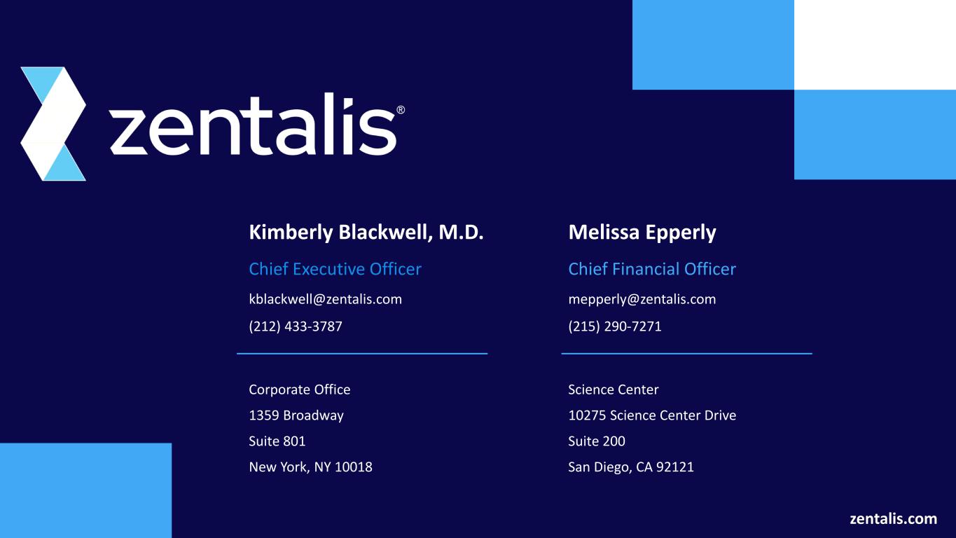 zentalis.com Kimberly Blackwell, M.D. Chief Executive Officer kblackwell@zentalis.com (212) 433-3787 Melissa Epperly Chief Financial Officer mepperly@zentalis.com (215) 290-7271 Corporate Office 1359 Broadway Suite 801 New York, NY 10018 Science Center 10275 Science Center Drive Suite 200 San Diego, CA 92121