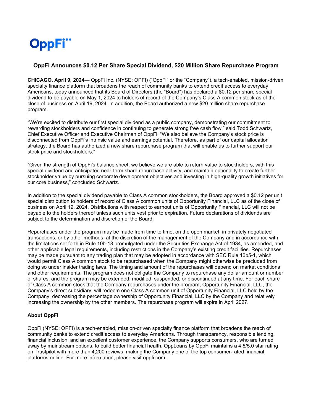 OppFi Announces $0.12 Per Share Special Dividend, $20 Million Share Repurchase Program CHICAGO, April 9, 2024— OppFi Inc. (NYSE: OPFI) (“OppFi” or the “Company”), a tech-enabled, mission-driven specialty finance platform that broadens the reach of community banks to extend credit access to everyday Americans, today announced that its Board of Directors (the “Board”) has declared a $0.12 per share special dividend to be payable on May 1, 2024 to holders of record of the Company’s Class A common stock as of the close of business on April 19, 2024. In addition, the Board authorized a new $20 million share repurchase program. “We’re excited to distribute our first special dividend as a public company, demonstrating our commitment to rewarding stockholders and confidence in continuing to generate strong free cash flow,” said Todd Schwartz, Chief Executive Officer and Executive Chairman of OppFi. “We also believe the Company's stock price is disconnected from OppFi's intrinsic value and earnings potential. Therefore, as part of our capital allocation strategy, the Board has authorized a new share repurchase program that will enable us to further support our stock price and stockholders.” “Given the strength of OppFi's balance sheet, we believe we are able to return value to stockholders, with this special dividend and anticipated near-term share repurchase activity, and maintain optionality to create further stockholder value by pursuing corporate development objectives and investing in high-quality growth initiatives for our core business,” concluded Schwartz. In addition to the special dividend payable to Class A common stockholders, the Board approved a $0.12 per unit special distribution to holders of record of Class A common units of Opportunity Financial, LLC as of the close of business on April 19, 2024. Distributions with respect to earnout units of Opportunity Financial, LLC will not be payable to the holders thereof unless such units vest prior to expiration. Future declarations of dividends are subject to the determination and discretion of the Board. Repurchases under the program may be made from time to time, on the open market, in privately negotiated transactions, or by other methods, at the discretion of the management of the Company and in accordance with the limitations set forth in Rule 10b-18 promulgated under the Securities Exchange Act of 1934, as amended, and other applicable legal requirements, including restrictions in the Company’s existing credit facilities. Repurchases may be made pursuant to any trading plan that may be adopted in accordance with SEC Rule 10b5-1, which would permit Class A common stock to be repurchased when the Company might otherwise be precluded from doing so under insider trading laws. The timing and amount of the repurchases will depend on market conditions and other requirements. The program does not obligate the Company to repurchase any dollar amount or number of shares, and the program may be extended, modified, suspended, or discontinued at any time. For each share of Class A common stock that the Company repurchases under the program, Opportunity Financial, LLC, the Company’s direct subsidiary, will redeem one Class A common unit of Opportunity Financial, LLC held by the Company, decreasing the percentage ownership of Opportunity Financial, LLC by the Company and relatively increasing the ownership by the other members. The repurchase program will expire in April 2027. About OppFi OppFi (NYSE: OPFI) is a tech-enabled, mission-driven specialty finance platform that broadens the reach of community banks to extend credit access to everyday Americans. Through transparency, responsible lending, financial inclusion, and an excellent customer experience, the Company supports consumers, who are turned away by mainstream options, to build better financial health. OppLoans by OppFi maintains a 4.5/5.0 star rating on Trustpilot with more than 4,200 reviews, making the Company one of the top consumer-rated financial platforms online. For more information, please visit oppfi.com.