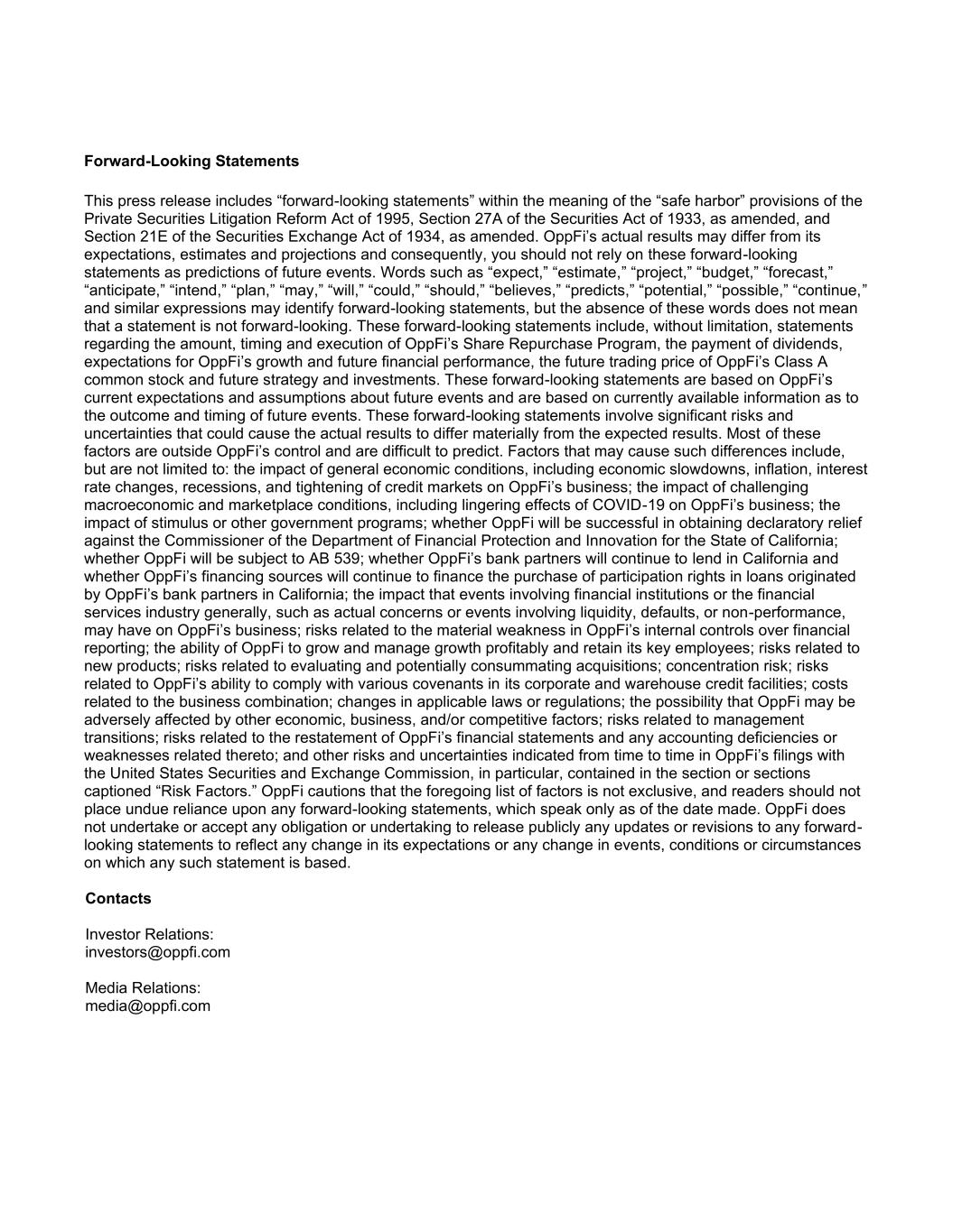 Forward-Looking Statements This press release includes “forward-looking statements” within the meaning of the “safe harbor” provisions of the Private Securities Litigation Reform Act of 1995, Section 27A of the Securities Act of 1933, as amended, and Section 21E of the Securities Exchange Act of 1934, as amended. OppFi’s actual results may differ from its expectations, estimates and projections and consequently, you should not rely on these forward-looking statements as predictions of future events. Words such as “expect,” “estimate,” “project,” “budget,” “forecast,” “anticipate,” “intend,” “plan,” “may,” “will,” “could,” “should,” “believes,” “predicts,” “potential,” “possible,” “continue,” and similar expressions may identify forward-looking statements, but the absence of these words does not mean that a statement is not forward-looking. These forward-looking statements include, without limitation, statements regarding the amount, timing and execution of OppFi’s Share Repurchase Program, the payment of dividends, expectations for OppFi’s growth and future financial performance, the future trading price of OppFi’s Class A common stock and future strategy and investments. These forward-looking statements are based on OppFi’s current expectations and assumptions about future events and are based on currently available information as to the outcome and timing of future events. These forward-looking statements involve significant risks and uncertainties that could cause the actual results to differ materially from the expected results. Most of these factors are outside OppFi’s control and are difficult to predict. Factors that may cause such differences include, but are not limited to: the impact of general economic conditions, including economic slowdowns, inflation, interest rate changes, recessions, and tightening of credit markets on OppFi’s business; the impact of challenging macroeconomic and marketplace conditions, including lingering effects of COVID-19 on OppFi’s business; the impact of stimulus or other government programs; whether OppFi will be successful in obtaining declaratory relief against the Commissioner of the Department of Financial Protection and Innovation for the State of California; whether OppFi will be subject to AB 539; whether OppFi’s bank partners will continue to lend in California and whether OppFi’s financing sources will continue to finance the purchase of participation rights in loans originated by OppFi’s bank partners in California; the impact that events involving financial institutions or the financial services industry generally, such as actual concerns or events involving liquidity, defaults, or non-performance, may have on OppFi’s business; risks related to the material weakness in OppFi’s internal controls over financial reporting; the ability of OppFi to grow and manage growth profitably and retain its key employees; risks related to new products; risks related to evaluating and potentially consummating acquisitions; concentration risk; risks related to OppFi’s ability to comply with various covenants in its corporate and warehouse credit facilities; costs related to the business combination; changes in applicable laws or regulations; the possibility that OppFi may be adversely affected by other economic, business, and/or competitive factors; risks related to management transitions; risks related to the restatement of OppFi’s financial statements and any accounting deficiencies or weaknesses related thereto; and other risks and uncertainties indicated from time to time in OppFi’s filings with the United States Securities and Exchange Commission, in particular, contained in the section or sections captioned “Risk Factors.” OppFi cautions that the foregoing list of factors is not exclusive, and readers should not place undue reliance upon any forward-looking statements, which speak only as of the date made. OppFi does not undertake or accept any obligation or undertaking to release publicly any updates or revisions to any forward- looking statements to reflect any change in its expectations or any change in events, conditions or circumstances on which any such statement is based. Contacts Investor Relations: investors@oppfi.com Media Relations: media@oppfi.com