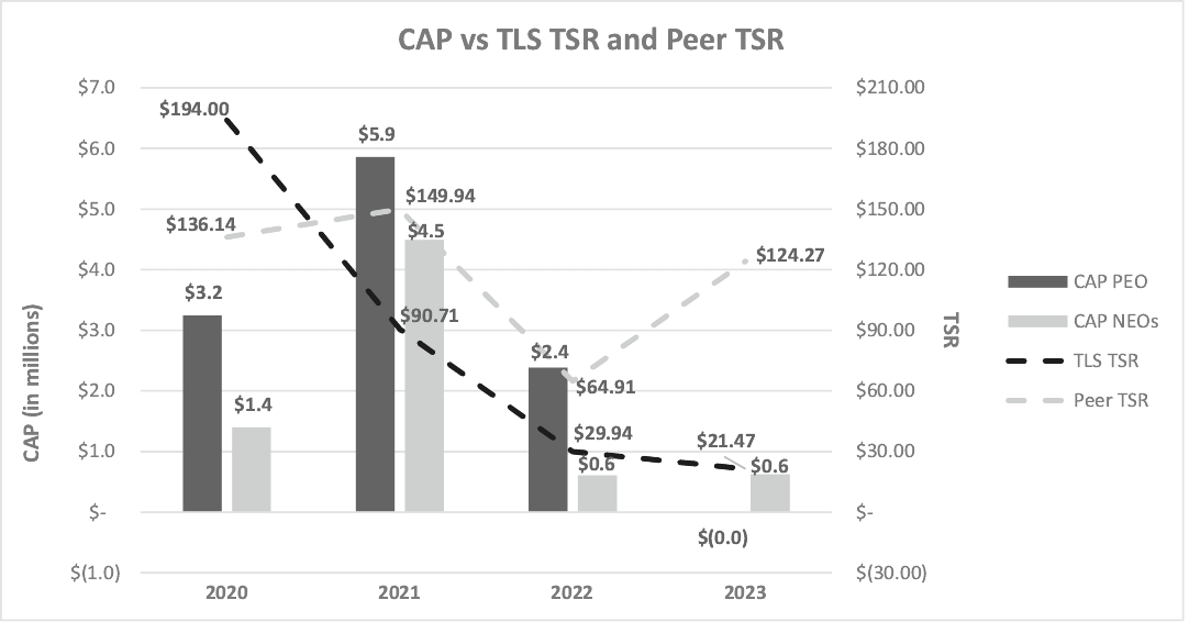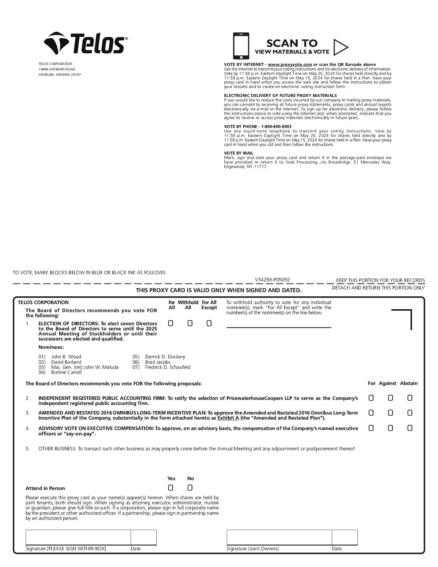 General Maluda, through his entity, JK Maluda LLC, and the Company were parties to a consulting agreement under which General Maluda provided certain consulting services to the Company. For his services from January 1 through June 30, 2023, General Maluda received a grant on January 3, 2023 of Telos’ restricted share units valued at $87,500 (16,849 restricted share units), of which 8,430 shares vested on March 8, 2023 and 8,429 shares vested on May 18, 2023. For services rendered from July 1 to December 31, 2023, the consulting agreement was amended. General Maluda received a retainer of $7,500 per month; $21,000 for attending seven events ($3,000 per event), such as trade shows or customer meetings; and a bonus payment of $25,000 for his role in facilitating the renewal and extension of a specific contract. The consulting agreement between Gen. Maluda and the Company expired on December 31, 2023.