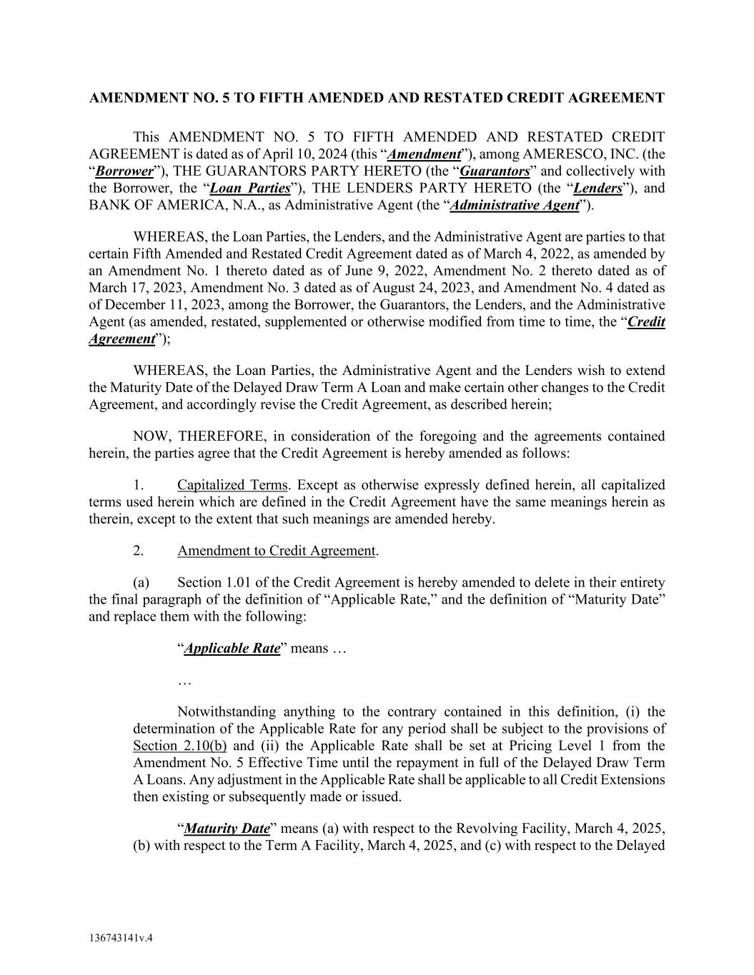 AMENDMENT NO. 5 TO FIFTH AMENDED AND RESTATED CREDIT AGREEMENT This AMENDMENT NO. 5 TO FIFTH AMENDED AND RESTATED CREDIT AGREEMENT is dated as of April 10, 2024 (this “Amendment”), among AMERESCO, INC. (the “Borrower”), THE GUARANTORS PARTY HERETO (the “Guarantors” and collectively with the Borrower, the “Loan Parties”), THE LENDERS PARTY HERETO (the “Lenders”), and BANK OF AMERICA, N.A., as Administrative Agent (the “Administrative Agent”). WHEREAS, the Loan Parties, the Lenders, and the Administrative Agent are parties to that certain Fifth Amended and Restated Credit Agreement dated as of March 4, 2022, as amended by an Amendment No. 1 thereto dated as of June 9, 2022, Amendment No. 2 thereto dated as of March 17, 2023, Amendment No. 3 dated as of August 24, 2023, and Amendment No. 4 dated as of December 11, 2023, among the Borrower, the Guarantors, the Lenders, and the Administrative Agent (as amended, restated, supplemented or otherwise modified from time to time, the “Credit Agreement”); WHEREAS, the Loan Parties, the Administrative Agent and the Lenders wish to extend the Maturity Date of the Delayed Draw Term A Loan and make certain other changes to the Credit Agreement, and accordingly revise the Credit Agreement, as described herein; NOW, THEREFORE, in consideration of the foregoing and the agreements contained herein, the parties agree that the Credit Agreement is hereby amended as follows: 1. Capitalized Terms. Except as otherwise expressly defined herein, all capitalized terms used herein which are defined in the Credit Agreement have the same meanings herein as therein, except to the extent that such meanings are amended hereby. 2. Amendment to Credit Agreement. (a) Section 1.01 of the Credit Agreement is hereby amended to delete in their entirety the final paragraph of the definition of “Applicable Rate,” and the definition of “Maturity Date” and replace them with the following: “Applicable Rate” means … … Notwithstanding anything to the contrary contained in this definition, (i) the determination of the Applicable Rate for any period shall be subject to the provisions of Section 2.10(b) and (ii) the Applicable Rate shall be set at Pricing Level 1 from the Amendment No. 5 Effective Time until the repayment in full of the Delayed Draw Term A Loans. Any adjustment in the Applicable Rate shall be applicable to all Credit Extensions then existing or subsequently made or issued. “Maturity Date” means (a) with respect to the Revolving Facility, March 4, 2025, (b) with respect to the Term A Facility, March 4, 2025, and (c) with respect to the Delayed 136743141v.4