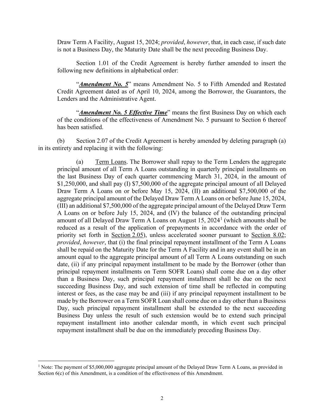 2 Draw Term A Facility, August 15, 2024; provided, however, that, in each case, if such date is not a Business Day, the Maturity Date shall be the next preceding Business Day. Section 1.01 of the Credit Agreement is hereby further amended to insert the following new definitions in alphabetical order: “Amendment No. 5” means Amendment No. 5 to Fifth Amended and Restated Credit Agreement dated as of April 10, 2024, among the Borrower, the Guarantors, the Lenders and the Administrative Agent. “Amendment No. 5 Effective Time” means the first Business Day on which each of the conditions of the effectiveness of Amendment No. 5 pursuant to Section 6 thereof has been satisfied. (b) Section 2.07 of the Credit Agreement is hereby amended by deleting paragraph (a) in its entirety and replacing it with the following: (a) Term Loans. The Borrower shall repay to the Term Lenders the aggregate principal amount of all Term A Loans outstanding in quarterly principal installments on the last Business Day of each quarter commencing March 31, 2024, in the amount of $1,250,000, and shall pay (I) $7,500,000 of the aggregate principal amount of all Delayed Draw Term A Loans on or before May 15, 2024, (II) an additional $7,500,000 of the aggregate principal amount of the Delayed Draw Term A Loans on or before June 15, 2024, (III) an additional $7,500,000 of the aggregate principal amount of the Delayed Draw Term A Loans on or before July 15, 2024, and (IV) the balance of the outstanding principal amount of all Delayed Draw Term A Loans on August 15, 20241 (which amounts shall be reduced as a result of the application of prepayments in accordance with the order of priority set forth in Section 2.05), unless accelerated sooner pursuant to Section 8.02; provided, however, that (i) the final principal repayment installment of the Term A Loans shall be repaid on the Maturity Date for the Term A Facility and in any event shall be in an amount equal to the aggregate principal amount of all Term A Loans outstanding on such date, (ii) if any principal repayment installment to be made by the Borrower (other than principal repayment installments on Term SOFR Loans) shall come due on a day other than a Business Day, such principal repayment installment shall be due on the next succeeding Business Day, and such extension of time shall be reflected in computing interest or fees, as the case may be and (iii) if any principal repayment installment to be made by the Borrower on a Term SOFR Loan shall come due on a day other than a Business Day, such principal repayment installment shall be extended to the next succeeding Business Day unless the result of such extension would be to extend such principal repayment installment into another calendar month, in which event such principal repayment installment shall be due on the immediately preceding Business Day. 1 Note: The payment of $5,000,000 aggregate principal amount of the Delayed Draw Term A Loans, as provided in Section 6(c) of this Amendment, is a condition of the effectiveness of this Amendment.