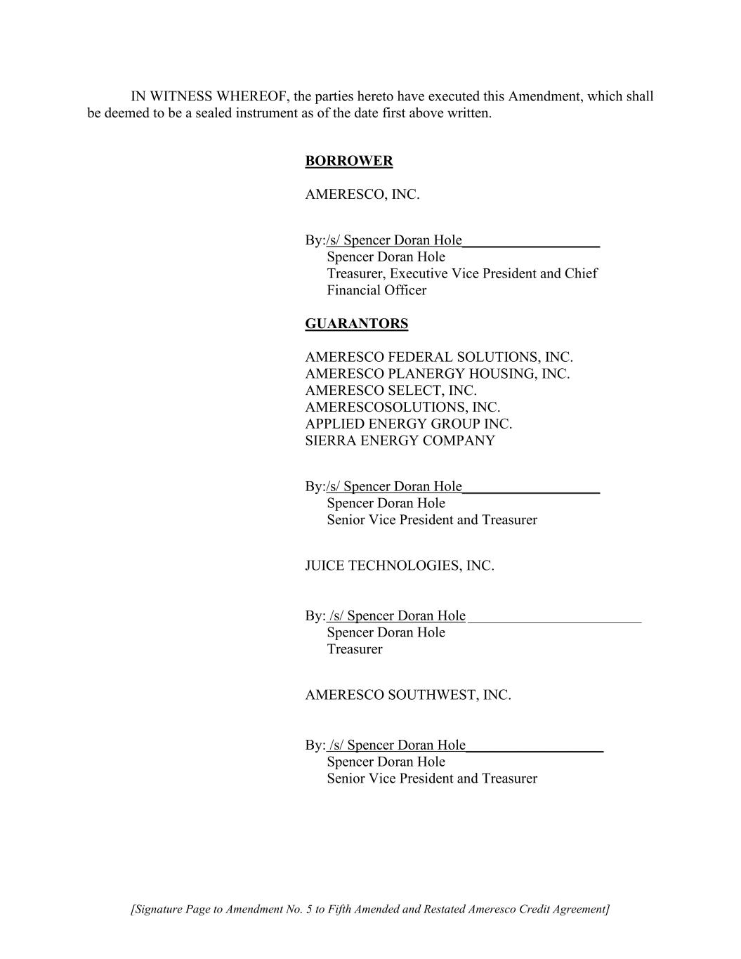 [Signature Page to Amendment No. 5 to Fifth Amended and Restated Ameresco Credit Agreement] IN WITNESS WHEREOF, the parties hereto have executed this Amendment, which shall be deemed to be a sealed instrument as of the date first above written. BORROWER AMERESCO, INC. By:/s/ Spencer Doran Hole___________________ Spencer Doran Hole Treasurer, Executive Vice President and Chief Financial Officer GUARANTORS AMERESCO FEDERAL SOLUTIONS, INC. AMERESCO PLANERGY HOUSING, INC. AMERESCO SELECT, INC. AMERESCOSOLUTIONS, INC. APPLIED ENERGY GROUP INC. SIERRA ENERGY COMPANY By:/s/ Spencer Doran Hole___________________ Spencer Doran Hole Senior Vice President and Treasurer JUICE TECHNOLOGIES, INC. By: /s/ Spencer Doran Hole __________________________ Spencer Doran Hole Treasurer AMERESCO SOUTHWEST, INC. By: /s/ Spencer Doran Hole___________________ Spencer Doran Hole Senior Vice President and Treasurer