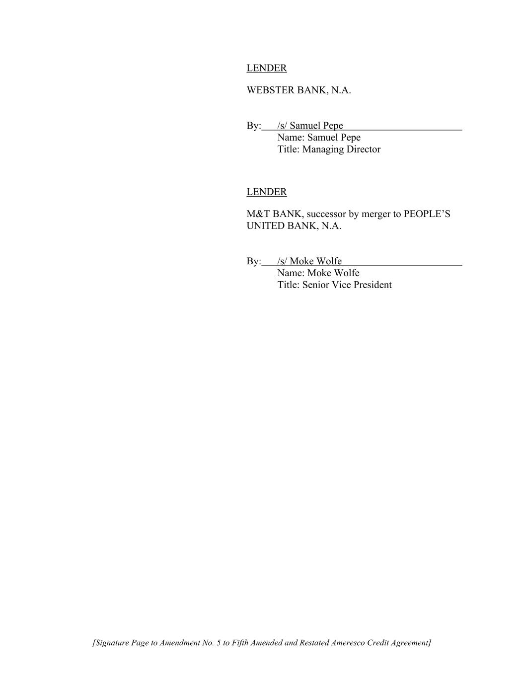[Signature Page to Amendment No. 5 to Fifth Amended and Restated Ameresco Credit Agreement] LENDER WEBSTER BANK, N.A. By: /s/ Samuel Pepe Name: Samuel Pepe Title: Managing Director LENDER M&T BANK, successor by merger to PEOPLE’S UNITED BANK, N.A. By: /s/ Moke Wolfe Name: Moke Wolfe Title: Senior Vice President
