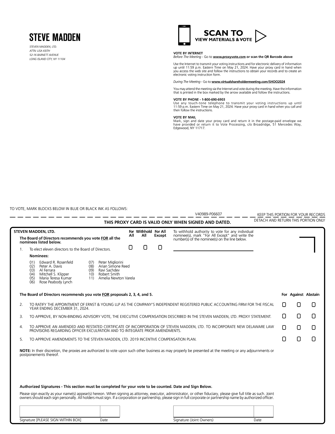 The Board of Directors of Steven Madden, Ltd. requests your proxy in connection with the Annual Meeting of Stockholders (the “Annual Meeting”) of Steven Madden, Ltd. (the “Company,” “we,” or “our”). The Annual Meeting will be held on Wednesday, May 22, 2024, at 10:00 a.m. Eastern time in a virtual-only format. Proxies also may be voted at any adjournments or postponements of the Annual Meeting. You will not be able to attend the Annual Meeting physically in person.