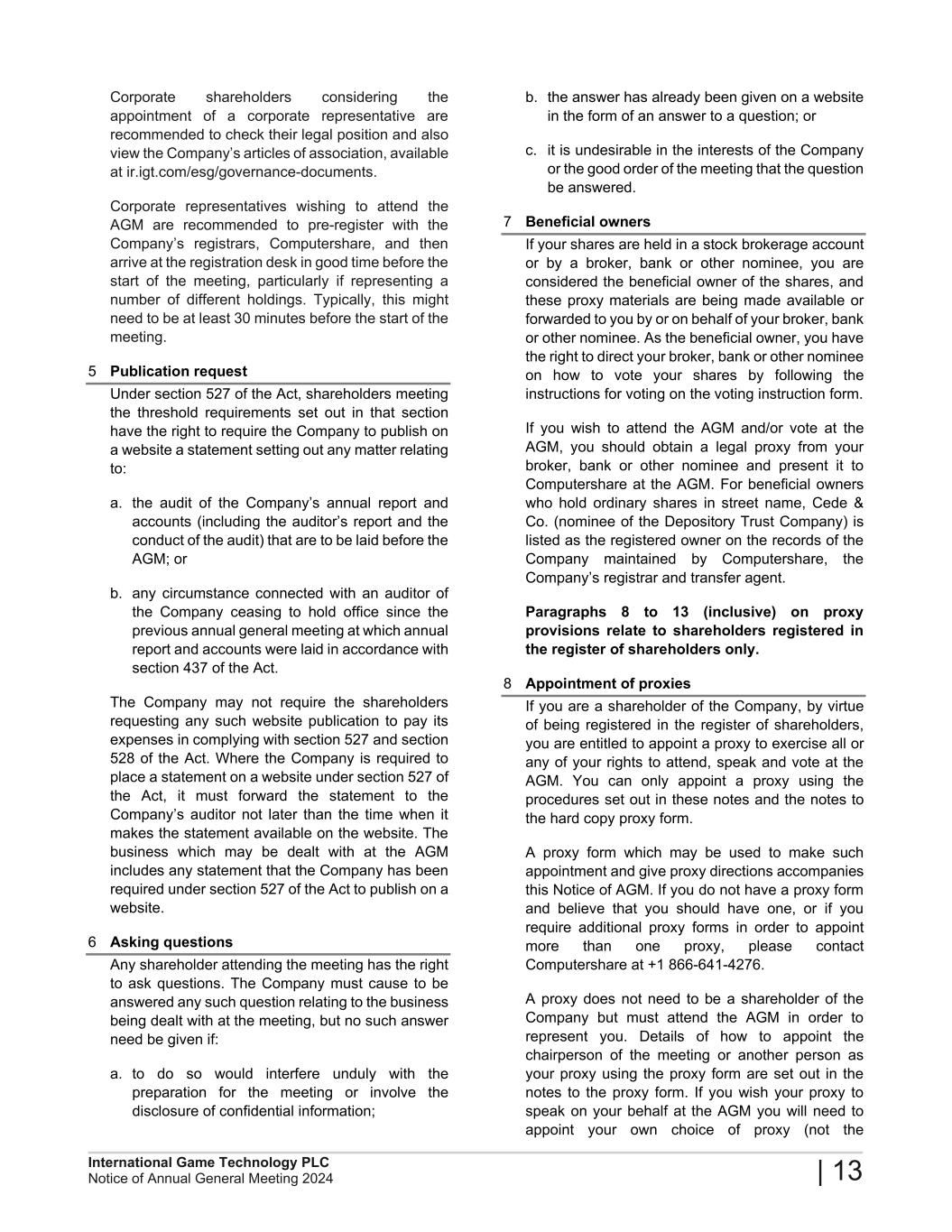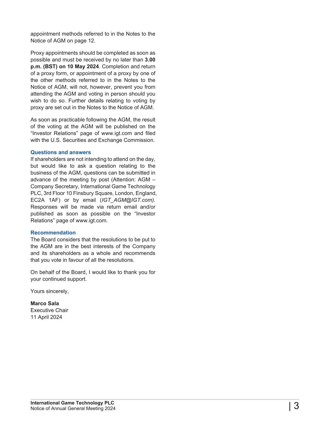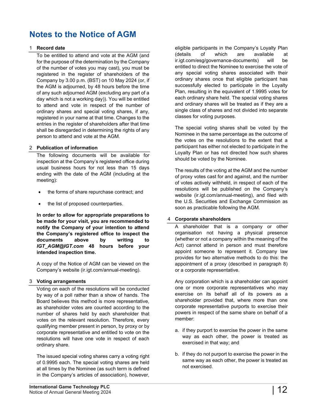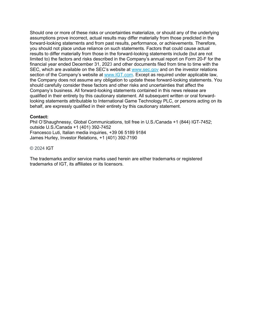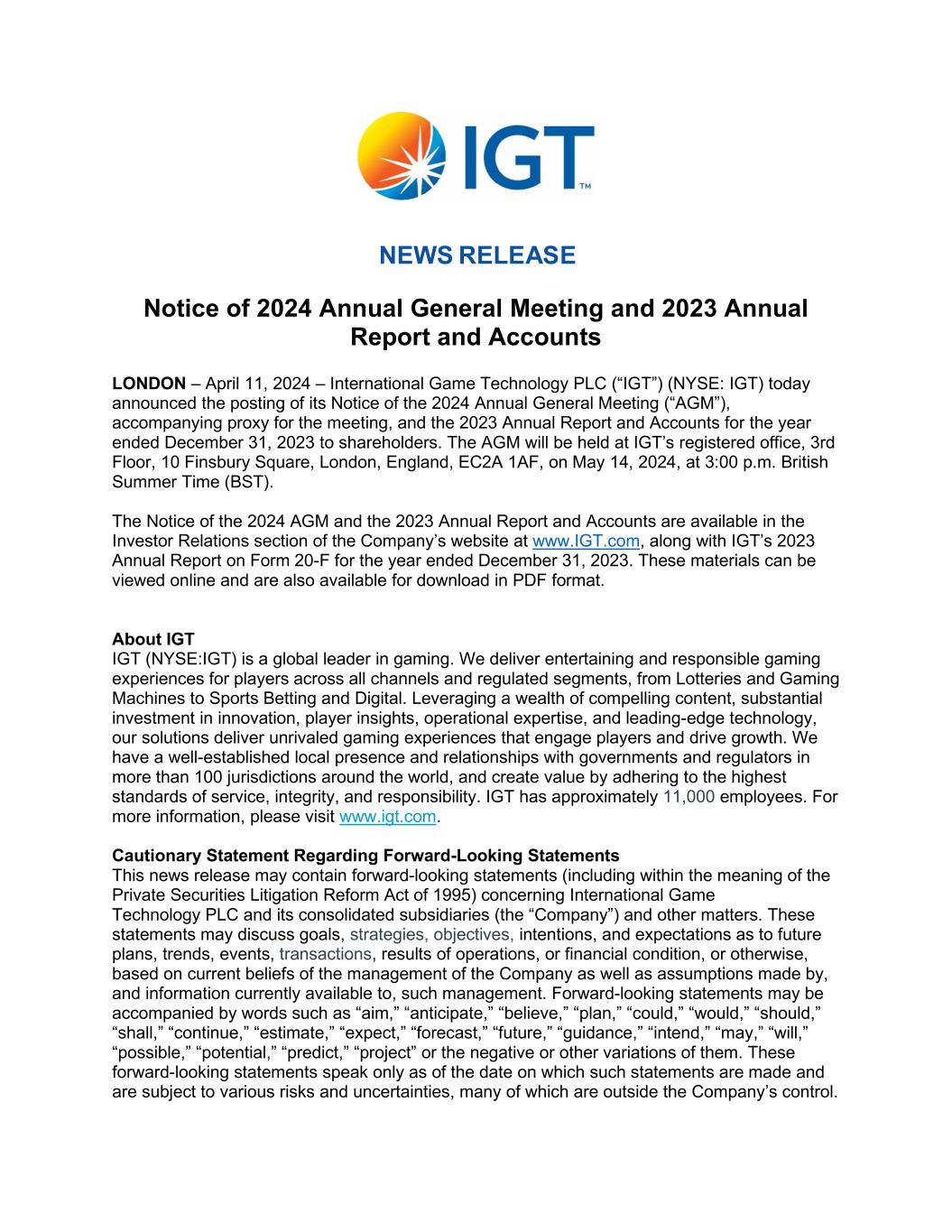 The Notice of the 2024 AGM and the 2023 ARA can be found in the Investor Relations section of www.igt.com, along with the Company's 2023 Annual Report on Form 20-F, which was filed with the U.S. Securities and Exchange Commission on March 12, 2024. These materials can be viewed online and are available for download in PDF format.