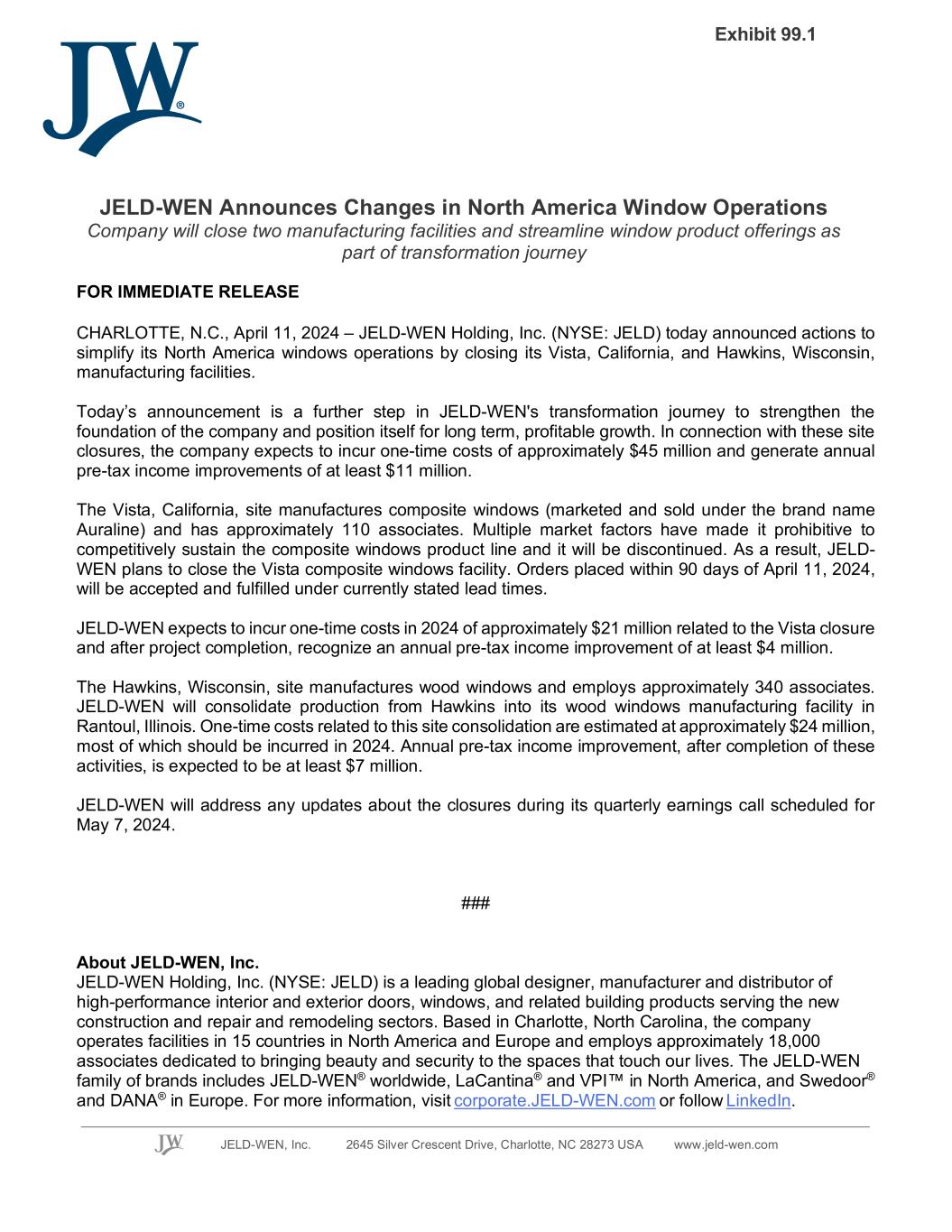 JELD-WEN, Inc. 2645 Silver Crescent Drive, Charlotte, NC 28273 USA www.jeld-wen.com JELD-WEN Announces Changes in North America Window Operations Company will close two manufacturing facilities and streamline window product offerings as part of transformation journey FOR IMMEDIATE RELEASE CHARLOTTE, N.C., April 11, 2024 – JELD-WEN Holding, Inc. (NYSE: JELD) today announced actions to simplify its North America windows operations by closing its Vista, California, and Hawkins, Wisconsin, manufacturing facilities. Today’s announcement is a further step in JELD-WEN's transformation journey to strengthen the foundation of the company and position itself for long term, profitable growth. In connection with these site closures, the company expects to incur one-time costs of approximately $45 million and generate annual pre-tax income improvements of at least $11 million. The Vista, California, site manufactures composite windows (marketed and sold under the brand name Auraline) and has approximately 110 associates. Multiple market factors have made it prohibitive to competitively sustain the composite windows product line and it will be discontinued. As a result, JELD- WEN plans to close the Vista composite windows facility. Orders placed within 90 days of April 11, 2024, will be accepted and fulfilled under currently stated lead times. JELD-WEN expects to incur one-time costs in 2024 of approximately $21 million related to the Vista closure and after project completion, recognize an annual pre-tax income improvement of at least $4 million. The Hawkins, Wisconsin, site manufactures wood windows and employs approximately 340 associates. JELD-WEN will consolidate production from Hawkins into its wood windows manufacturing facility in Rantoul, Illinois. One-time costs related to this site consolidation are estimated at approximately $24 million, most of which should be incurred in 2024. Annual pre-tax income improvement, after completion of these activities, is expected to be at least $7 million. JELD-WEN will address any updates about the closures during its quarterly earnings call scheduled for May 7, 2024. ### About JELD-WEN, Inc. JELD-WEN Holding, Inc. (NYSE: JELD) is a leading global designer, manufacturer and distributor of high-performance interior and exterior doors, windows, and related building products serving the new construction and repair and remodeling sectors. Based in Charlotte, North Carolina, the company operates facilities in 15 countries in North America and Europe and employs approximately 18,000 associates dedicated to bringing beauty and security to the spaces that touch our lives. The JELD-WEN family of brands includes JELD-WEN® worldwide, LaCantina® and VPI™ in North America, and Swedoor® and DANA® in Europe. For more information, visit corporate.JELD-WEN.com or follow LinkedIn. Exhibit 99.1