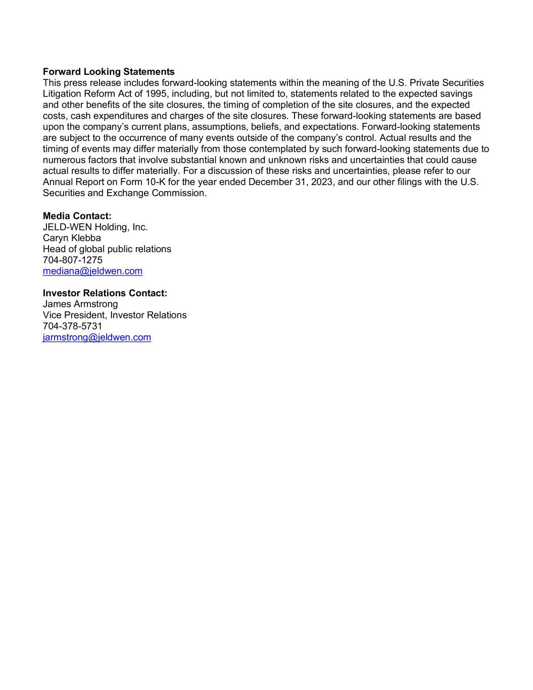 Forward Looking Statements This press release includes forward-looking statements within the meaning of the U.S. Private Securities Litigation Reform Act of 1995, including, but not limited to, statements related to the expected savings and other benefits of the site closures, the timing of completion of the site closures, and the expected costs, cash expenditures and charges of the site closures. These forward-looking statements are based upon the company’s current plans, assumptions, beliefs, and expectations. Forward-looking statements are subject to the occurrence of many events outside of the company’s control. Actual results and the timing of events may differ materially from those contemplated by such forward-looking statements due to numerous factors that involve substantial known and unknown risks and uncertainties that could cause actual results to differ materially. For a discussion of these risks and uncertainties, please refer to our Annual Report on Form 10-K for the year ended December 31, 2023, and our other filings with the U.S. Securities and Exchange Commission. Media Contact: JELD-WEN Holding, Inc. Caryn Klebba Head of global public relations 704-807-1275 mediana@jeldwen.com Investor Relations Contact: James Armstrong Vice President, Investor Relations 704-378-5731 jarmstrong@jeldwen.com