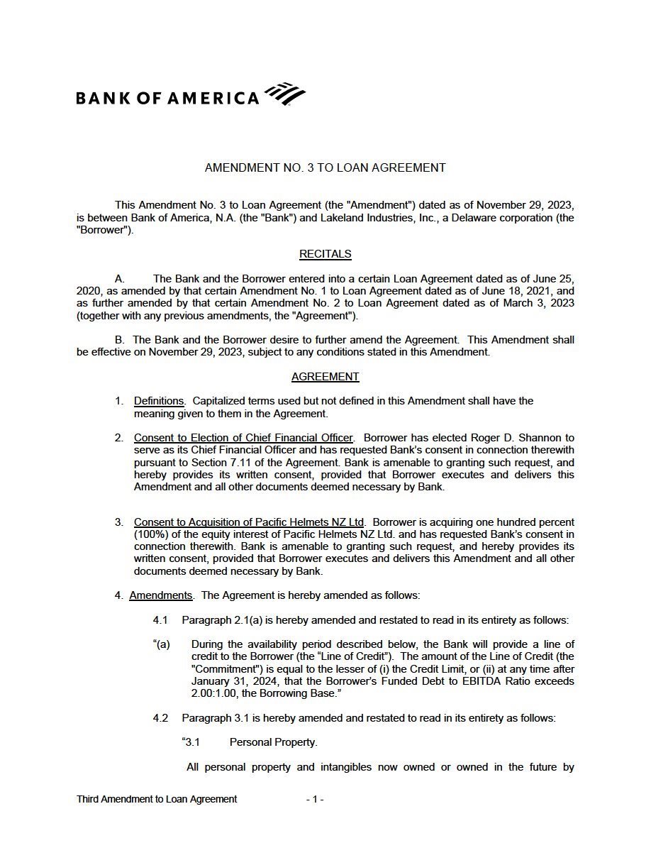 Available Information - Our Internet address is www.Lakeland.com. We make the following filings available free of charge on the Investor Relations page on our website as soon as they have been electronically filed with or furnished to the Securities and Exchange Commission ("SEC"): our annual reports on Form 10-K, our quarterly reports on Form 10-Q, our current reports on Form 8-K and any amendments to those reports filed or furnished pursuant to Section 13(a) or 15(d) of the Securities Exchange Act of 1934, as well as our proxy statement. Information contained on our website is not part of this Annual Report on Form 10-K or our other filings with the SEC. The SEC maintains an Internet site at www.sec.gov that contains reports, proxy and information statements and other information regarding issuers like us who file electronically with the SEC.