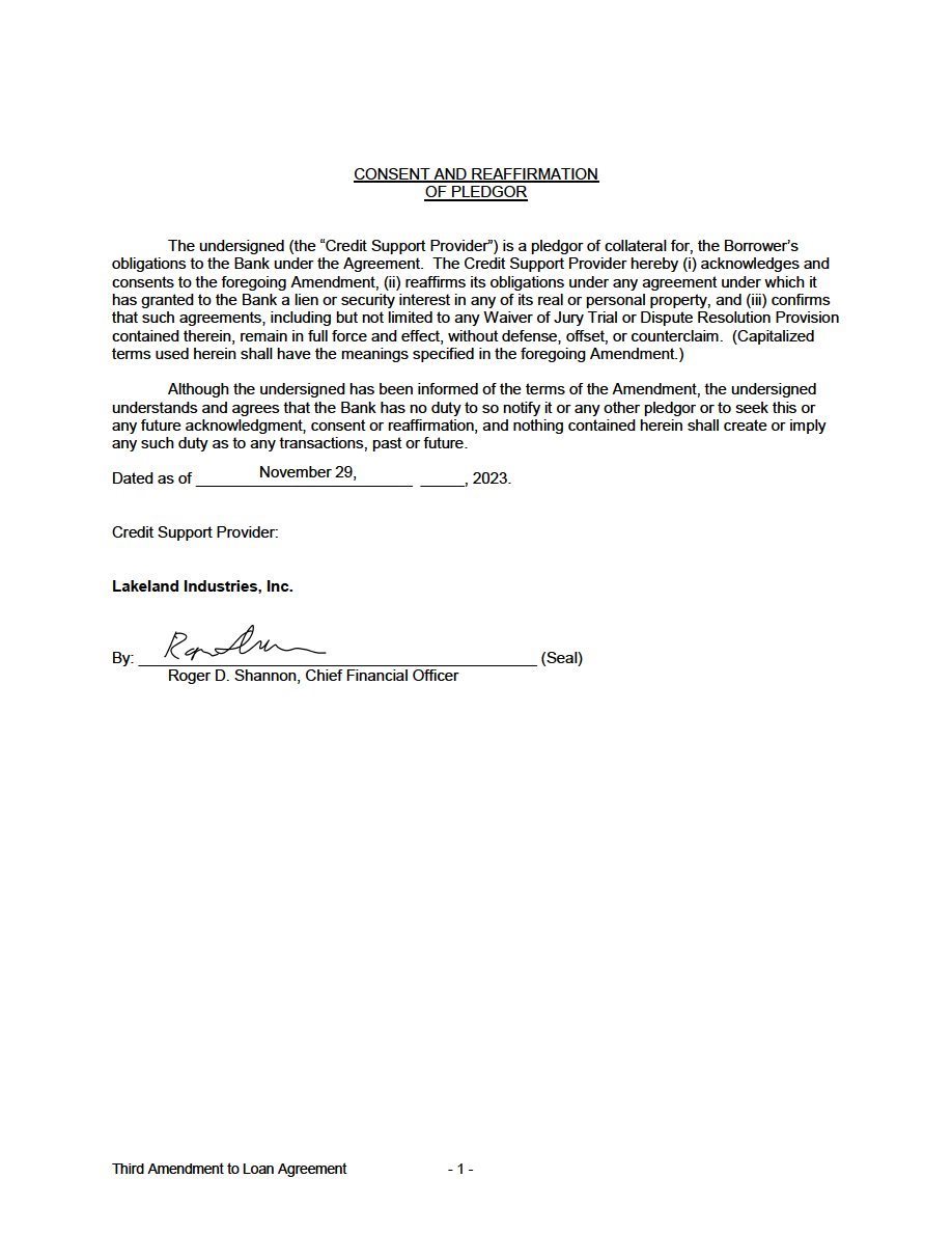 In connection with the filing with the Securities and Exchange Commission of the Annual Report of Lakeland Industries, Inc. (the “Company”) on Form 10-K for the year ended January 31, 2024 (the “Report”), I, Roger D. Shannon, Chief Financial Officer and Secretary of the Company, certify, pursuant to 18 USC. § 1350, as adopted pursuant to § 906 of the Sarbanes-Oxley Act of 2002, that to the best of my knowledge: