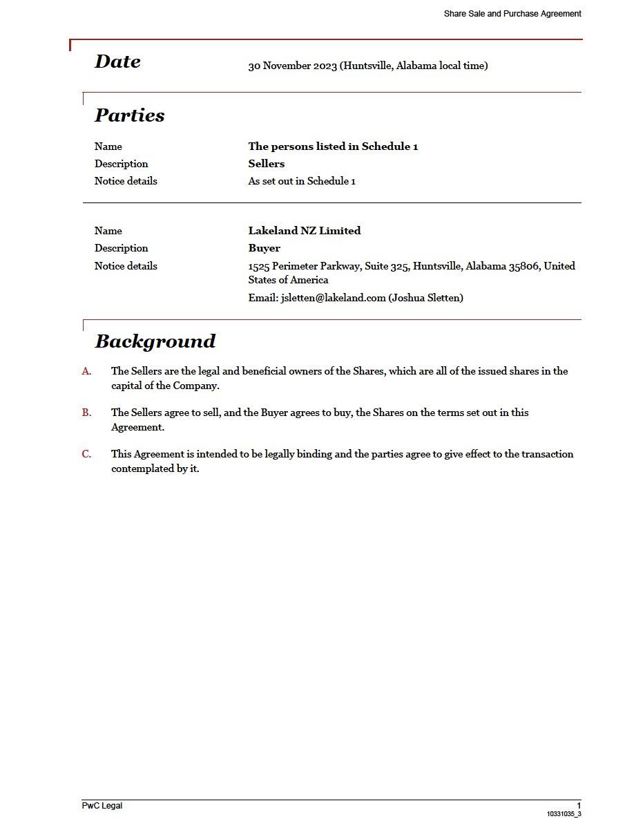 On November 30, 2023 the Company acquired New Zealand-based Pacific Helmets NZ Limited (“Pacific”) in an all-cash transaction valued at approximately NZ$14,000,000 ($8.6 million) including assumption of debt, subject to post-closing adjustments and customary holdback provisions. The acquisition enhances Lakeland’s product portfolio, particularly within fire service protective helmets. Headquartered in Whanganui, New Zealand, Pacific is a leading designer and provider of structural firefighting, wildland firefighting, and technical rescue helmets.