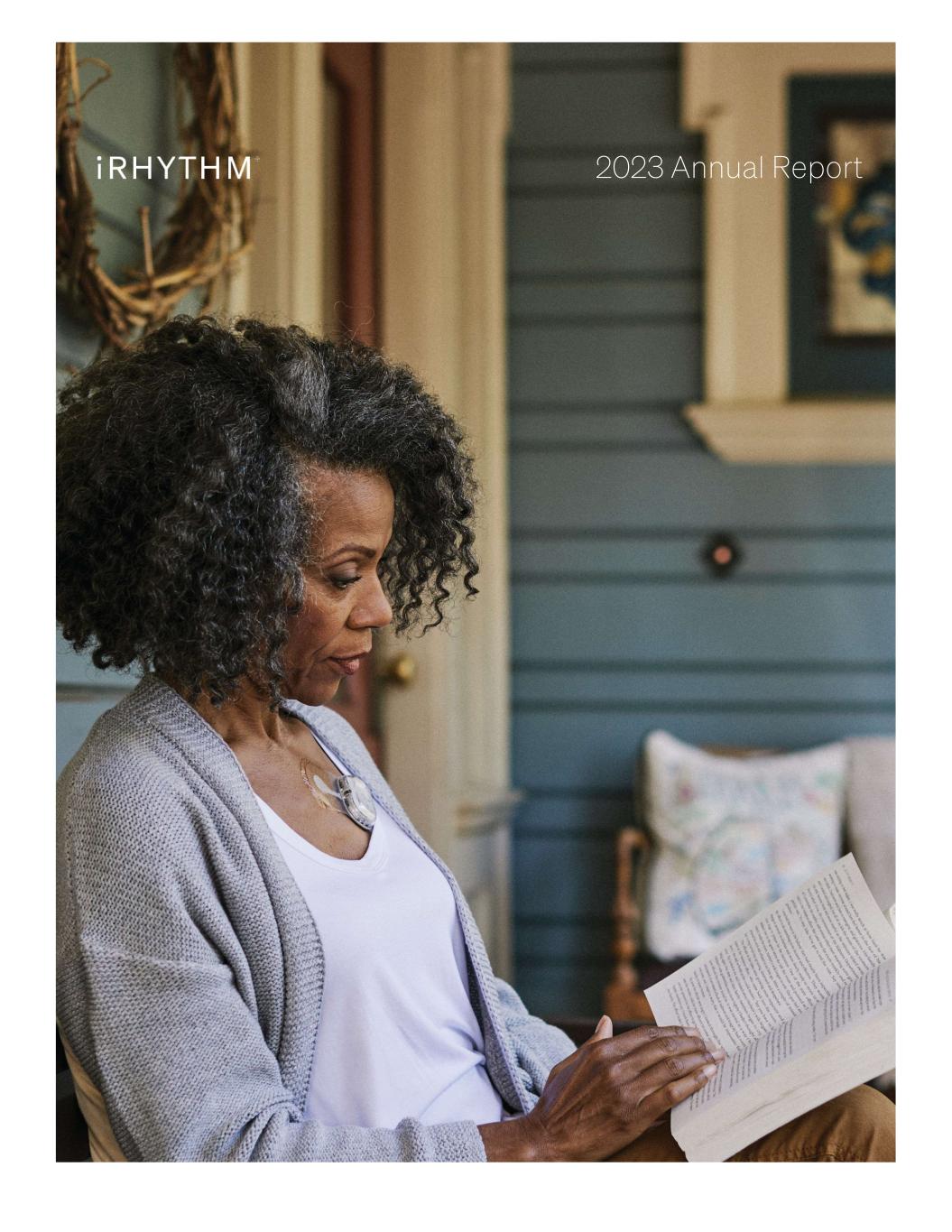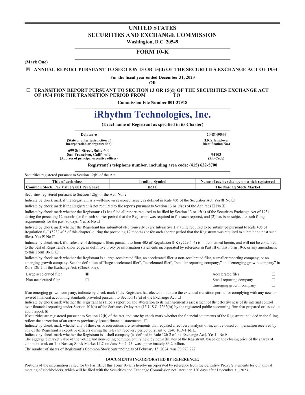 UNITED STATES SECURITIES AND EXCHANGE COMMISSION Washington, D.C. 20549 ________________________________________________________________________________________________________ FORM 10-K ________________________________________________________________________________________________________ (Mark One) ☒ ANNUAL REPORT PURSUANT TO SECTION 13 OR 15(d) OF THE SECURITIES EXCHANGE ACT OF 1934 For the fiscal year ended December 31, 2023 OR ☐ TRANSITION REPORT PURSUANT TO SECTION 13 OR 15(d) OF THE SECURITIES EXCHANGE ACT OF 1934 FOR THE TRANSITION PERIOD FROM TO Commission File Number 001-37918 ________________________________________________________________________________________________________ iRhythm Technologies, Inc. (Exact name of Registrant as specified in its Charter) ________________________________________________________________________________________________________ Delaware 20-8149544 (State or other jurisdiction of incorporation or organization) (I.R.S. Employer Identification No.) 699 8th Street, Suite 600 San Francisco, California (Address of principal executive offices) 94103 (Zip Code) Registrant’s telephone number, including area code: (415) 632-5700 ________________________________________________________________________________________________________ Securities registered pursuant to Section 12(b) of the Act: Title of each class Trading Symbol Name of each exchange on which registered Common Stock, Par Value $.001 Per Share IRTC The Nasdaq Stock Market Securities registered pursuant to Section 12(g) of the Act: None Indicate by check mark if the Registrant is a well-known seasoned issuer, as defined in Rule 405 of the Securities Act. Yes ☒ No ☐ Indicate by check mark if the Registrant is not required to file reports pursuant to Section 13 or 15(d) of the Act. Yes ☐ No ☒ Indicate by check mark whether the Registrant: (1) has filed all reports required to be filed by Section 13 or 15(d) of the Securities Exchange Act of 1934 during the preceding 12 months (or for such shorter period that the Registrant was required to file such reports), and (2) has been subject to such filing requirements for the past 90 days. Yes ☒ No ☐ Indicate by check mark whether the Registrant has submitted electronically every Interactive Data File required to be submitted pursuant to Rule 405 of Regulation S-T (§232.405 of this chapter) during the preceding 12 months (or for such shorter period that the Registrant was required to submit and post such files). Yes ☒ No ☐ Indicate by check mark if disclosure of delinquent filers pursuant to Item 405 of Regulation S-K (§229.405) is not contained herein, and will not be contained, to the best of Registrant’s knowledge, in definitive proxy or information statements incorporated by reference in Part III of this Form 10-K or any amendment to this Form 10-K. ☐ Indicate by check mark whether the Registrant is a large accelerated filer, an accelerated filer, a non-accelerated filer, a smaller reporting company, or an emerging growth company. See the definition of “large accelerated filer”, “accelerated filer”, “smaller reporting company,” and “emerging growth company” in Rule 12b-2 of the Exchange Act. (Check one): Large accelerated filer ☒ Accelerated filer ☐ Non-accelerated filer ☐ Small reporting company ☐ Emerging growth company ☐ If an emerging growth company, indicate by check mark if the Registrant has elected not to use the extended transition period for complying with any new or revised financial accounting standards provided pursuant to Section 13(a) of the Exchange Act. ☐ Indicate by check mark whether the registrant has filed a report on and attestation to its management’s assessment of the effectiveness of its internal control over financial reporting under Section 404(b) of the Sarbanes-Oxley Act (15 U.S.C. 7262(b)) by the registered public accounting firm that prepared or issued its audit report. ☒ If securities are registered pursuant to Section 12(b) of the Act, indicate by check mark whether the financial statements of the Registrant included in the filing reflect the correction of an error to previously issued financial statements. ☐ Indicate by check mark whether any of those error corrections are restatements that required a recovery analysis of incentive-based compensation received by any of the Registrant’s executive officers during the relevant recovery period pursuant to §240.10D-1(b). ☐ Indicate by check mark whether the Registrant is a shell company (as defined in Rule 12b-2 of the Exchange Act). Yes ☐ No ☒ The aggregate market value of the voting and non-voting common equity held by non-affiliates of the Registrant, based on the closing price of the shares of common stock on The Nasdaq Stock Market LLC on June 30, 2023, was approximately $3.2 billion. The number of shares of Registrant’s Common Stock outstanding as of February 15, 2024, was 30,978,772. ______________________________________________________________________ DOCUMENTS INCORPORATED BY REFERENCE: Portions of the information called for by Part III of this Form 10-K is hereby incorporated by reference from the definitive Proxy Statements for our annual meeting of stockholders, which will be filed with the Securities and Exchange Commission not later than 120 days after December 31, 2023.