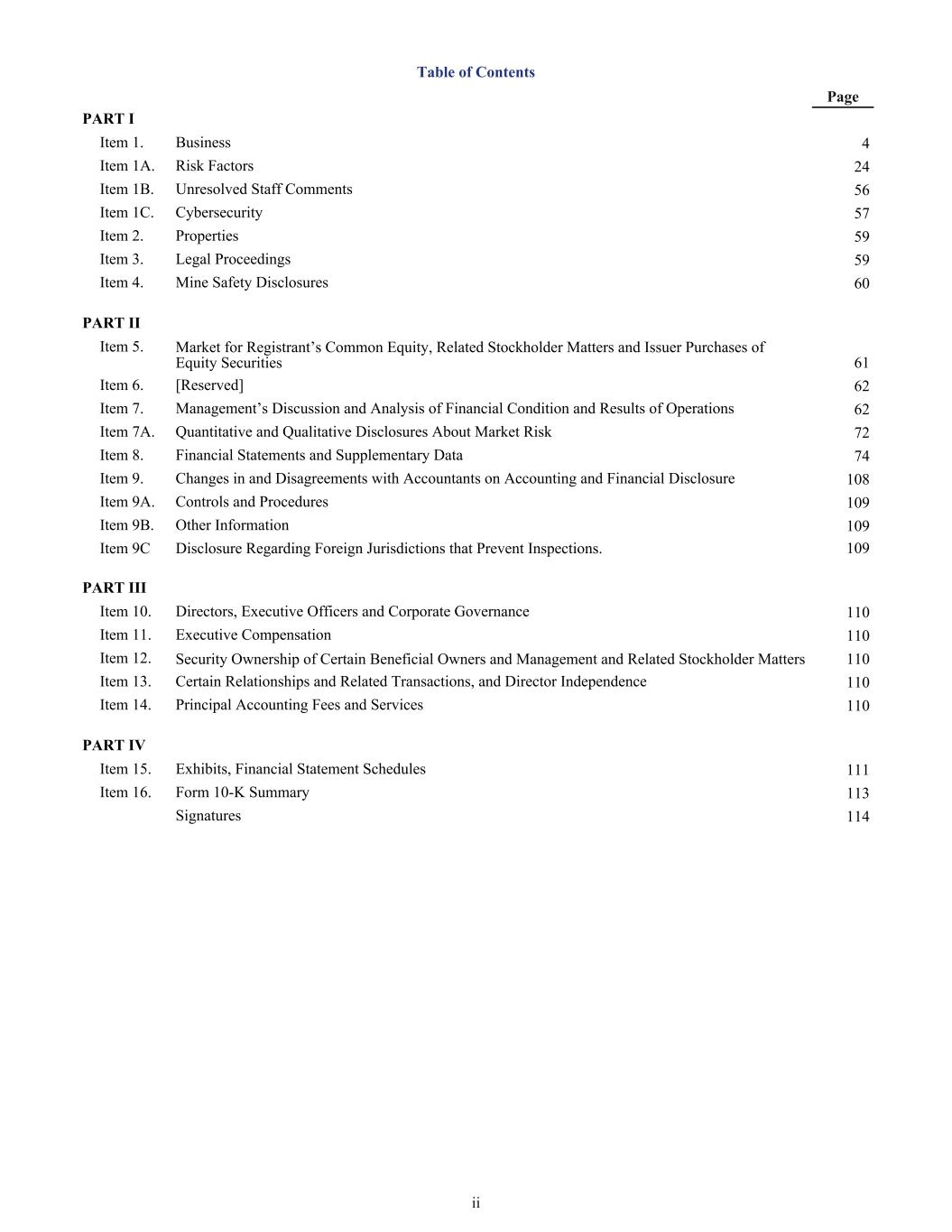 Table of Contents Page PART I Item 1. Business 4 Item 1A. Risk Factors 24 Item 1B. Unresolved Staff Comments 56 Item 1C. Cybersecurity 57 Item 2. Properties 59 Item 3. Legal Proceedings 59 Item 4. Mine Safety Disclosures 60 PART II Item 5. Market for Registrant’s Common Equity, Related Stockholder Matters and Issuer Purchases of Equity Securities 61 Item 6. [Reserved] 62 Item 7. Management’s Discussion and Analysis of Financial Condition and Results of Operations 62 Item 7A. Quantitative and Qualitative Disclosures About Market Risk 72 Item 8. Financial Statements and Supplementary Data 74 Item 9. Changes in and Disagreements with Accountants on Accounting and Financial Disclosure 108 Item 9A. Controls and Procedures 109 Item 9B. Other Information 109 Item 9C Disclosure Regarding Foreign Jurisdictions that Prevent Inspections. 109 PART III Item 10. Directors, Executive Officers and Corporate Governance 110 Item 11. Executive Compensation 110 Item 12. Security Ownership of Certain Beneficial Owners and Management and Related Stockholder Matters 110 Item 13. Certain Relationships and Related Transactions, and Director Independence 110 Item 14. Principal Accounting Fees and Services 110 PART IV Item 15. Exhibits, Financial Statement Schedules 111 Item 16. Form 10-K Summary 113 Signatures 114 ii