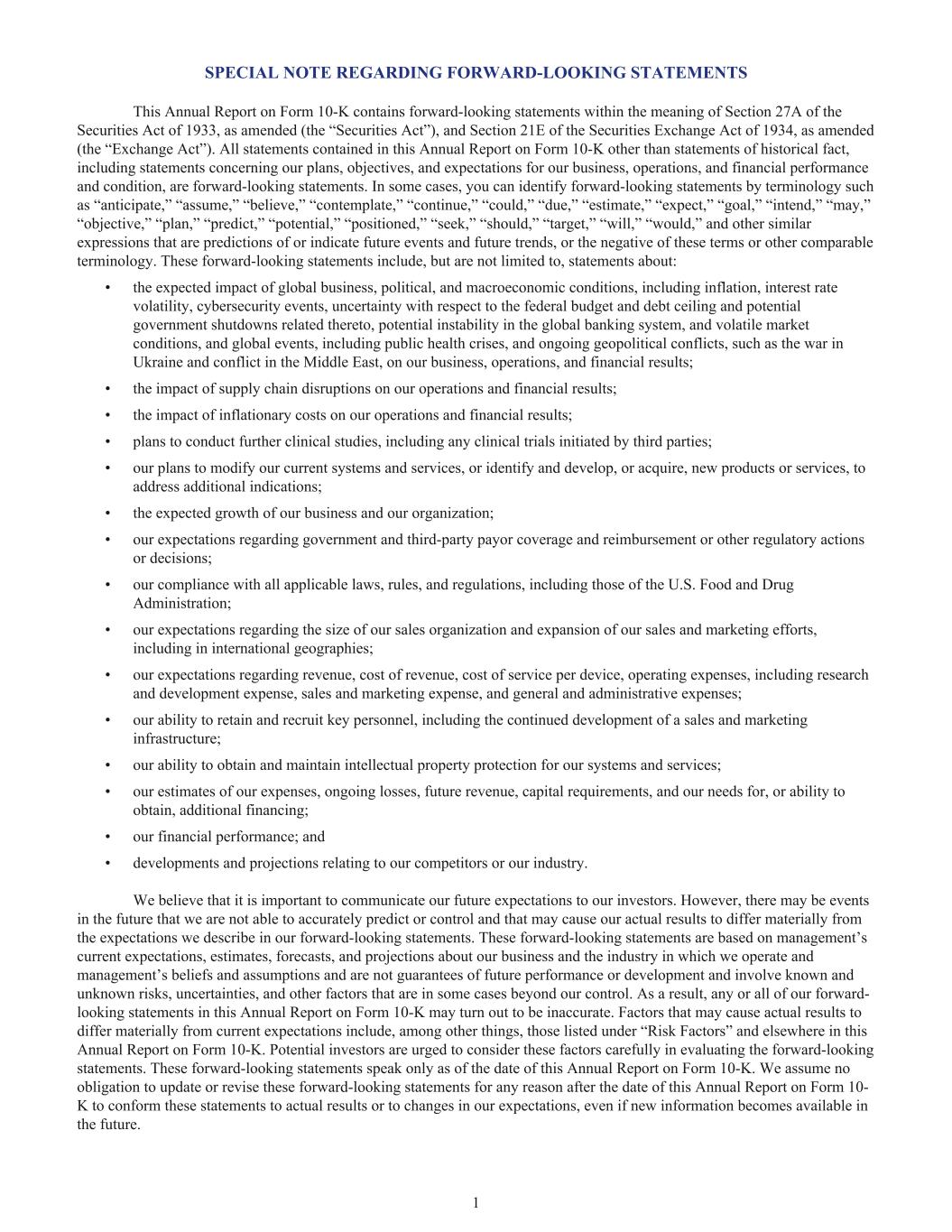 SPECIAL NOTE REGARDING FORWARD-LOOKING STATEMENTS This Annual Report on Form 10-K contains forward-looking statements within the meaning of Section 27A of the Securities Act of 1933, as amended (the “Securities Act”), and Section 21E of the Securities Exchange Act of 1934, as amended (the “Exchange Act”). All statements contained in this Annual Report on Form 10-K other than statements of historical fact, including statements concerning our plans, objectives, and expectations for our business, operations, and financial performance and condition, are forward-looking statements. In some cases, you can identify forward-looking statements by terminology such as “anticipate,” “assume,” “believe,” “contemplate,” “continue,” “could,” “due,” “estimate,” “expect,” “goal,” “intend,” “may,” “objective,” “plan,” “predict,” “potential,” “positioned,” “seek,” “should,” “target,” “will,” “would,” and other similar expressions that are predictions of or indicate future events and future trends, or the negative of these terms or other comparable terminology. These forward-looking statements include, but are not limited to, statements about: • the expected impact of global business, political, and macroeconomic conditions, including inflation, interest rate volatility, cybersecurity events, uncertainty with respect to the federal budget and debt ceiling and potential government shutdowns related thereto, potential instability in the global banking system, and volatile market conditions, and global events, including public health crises, and ongoing geopolitical conflicts, such as the war in Ukraine and conflict in the Middle East, on our business, operations, and financial results; • the impact of supply chain disruptions on our operations and financial results; • the impact of inflationary costs on our operations and financial results; • plans to conduct further clinical studies, including any clinical trials initiated by third parties; • our plans to modify our current systems and services, or identify and develop, or acquire, new products or services, to address additional indications; • the expected growth of our business and our organization; • our expectations regarding government and third-party payor coverage and reimbursement or other regulatory actions or decisions; • our compliance with all applicable laws, rules, and regulations, including those of the U.S. Food and Drug Administration; • our expectations regarding the size of our sales organization and expansion of our sales and marketing efforts, including in international geographies; • our expectations regarding revenue, cost of revenue, cost of service per device, operating expenses, including research and development expense, sales and marketing expense, and general and administrative expenses; • our ability to retain and recruit key personnel, including the continued development of a sales and marketing infrastructure; • our ability to obtain and maintain intellectual property protection for our systems and services; • our estimates of our expenses, ongoing losses, future revenue, capital requirements, and our needs for, or ability to obtain, additional financing; • our financial performance; and • developments and projections relating to our competitors or our industry. We believe that it is important to communicate our future expectations to our investors. However, there may be events in the future that we are not able to accurately predict or control and that may cause our actual results to differ materially from the expectations we describe in our forward-looking statements. These forward-looking statements are based on management’s current expectations, estimates, forecasts, and projections about our business and the industry in which we operate and management’s beliefs and assumptions and are not guarantees of future performance or development and involve known and unknown risks, uncertainties, and other factors that are in some cases beyond our control. As a result, any or all of our forward- looking statements in this Annual Report on Form 10-K may turn out to be inaccurate. Factors that may cause actual results to differ materially from current expectations include, among other things, those listed under “Risk Factors” and elsewhere in this Annual Report on Form 10-K. Potential investors are urged to consider these factors carefully in evaluating the forward-looking statements. These forward-looking statements speak only as of the date of this Annual Report on Form 10-K. We assume no obligation to update or revise these forward-looking statements for any reason after the date of this Annual Report on Form 10- K to conform these statements to actual results or to changes in our expectations, even if new information becomes available in the future. 1