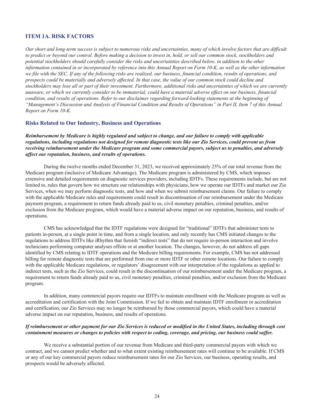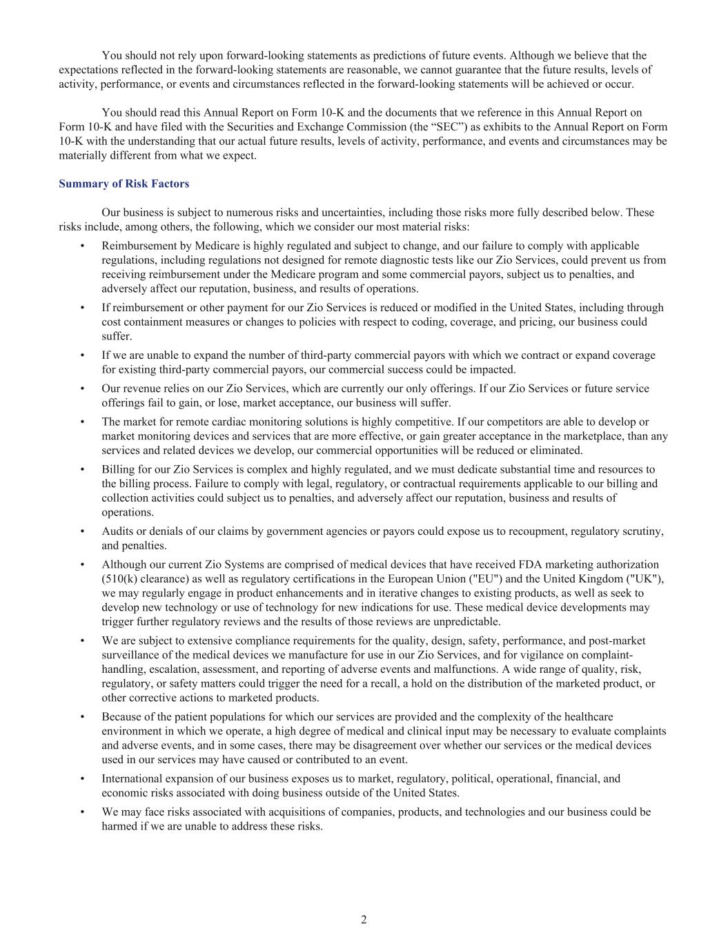 You should not rely upon forward-looking statements as predictions of future events. Although we believe that the expectations reflected in the forward-looking statements are reasonable, we cannot guarantee that the future results, levels of activity, performance, or events and circumstances reflected in the forward-looking statements will be achieved or occur. You should read this Annual Report on Form 10-K and the documents that we reference in this Annual Report on Form 10-K and have filed with the Securities and Exchange Commission (the “SEC”) as exhibits to the Annual Report on Form 10-K with the understanding that our actual future results, levels of activity, performance, and events and circumstances may be materially different from what we expect. Summary of Risk Factors Our business is subject to numerous risks and uncertainties, including those risks more fully described below. These risks include, among others, the following, which we consider our most material risks: • Reimbursement by Medicare is highly regulated and subject to change, and our failure to comply with applicable regulations, including regulations not designed for remote diagnostic tests like our Zio Services, could prevent us from receiving reimbursement under the Medicare program and some commercial payors, subject us to penalties, and adversely affect our reputation, business, and results of operations. • If reimbursement or other payment for our Zio Services is reduced or modified in the United States, including through cost containment measures or changes to policies with respect to coding, coverage, and pricing, our business could suffer. • If we are unable to expand the number of third-party commercial payors with which we contract or expand coverage for existing third-party commercial payors, our commercial success could be impacted. • Our revenue relies on our Zio Services, which are currently our only offerings. If our Zio Services or future service offerings fail to gain, or lose, market acceptance, our business will suffer. • The market for remote cardiac monitoring solutions is highly competitive. If our competitors are able to develop or market monitoring devices and services that are more effective, or gain greater acceptance in the marketplace, than any services and related devices we develop, our commercial opportunities will be reduced or eliminated. • Billing for our Zio Services is complex and highly regulated, and we must dedicate substantial time and resources to the billing process. Failure to comply with legal, regulatory, or contractual requirements applicable to our billing and collection activities could subject us to penalties, and adversely affect our reputation, business and results of operations. • Audits or denials of our claims by government agencies or payors could expose us to recoupment, regulatory scrutiny, and penalties. • Although our current Zio Systems are comprised of medical devices that have received FDA marketing authorization (510(k) clearance) as well as regulatory certifications in the European Union ("EU") and the United Kingdom ("UK"), we may regularly engage in product enhancements and in iterative changes to existing products, as well as seek to develop new technology or use of technology for new indications for use. These medical device developments may trigger further regulatory reviews and the results of those reviews are unpredictable. • We are subject to extensive compliance requirements for the quality, design, safety, performance, and post-market surveillance of the medical devices we manufacture for use in our Zio Services, and for vigilance on complaint- handling, escalation, assessment, and reporting of adverse events and malfunctions. A wide range of quality, risk, regulatory, or safety matters could trigger the need for a recall, a hold on the distribution of the marketed product, or other corrective actions to marketed products. • Because of the patient populations for which our services are provided and the complexity of the healthcare environment in which we operate, a high degree of medical and clinical input may be necessary to evaluate complaints and adverse events, and in some cases, there may be disagreement over whether our services or the medical devices used in our services may have caused or contributed to an event. • International expansion of our business exposes us to market, regulatory, political, operational, financial, and economic risks associated with doing business outside of the United States. • We may face risks associated with acquisitions of companies, products, and technologies and our business could be harmed if we are unable to address these risks. 2