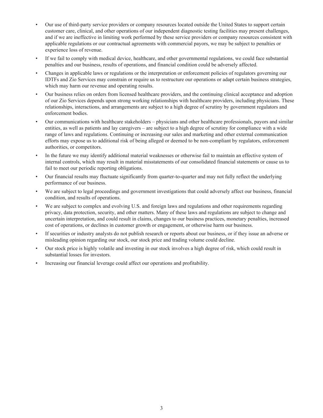 • Our use of third-party service providers or company resources located outside the United States to support certain customer care, clinical, and other operations of our independent diagnostic testing facilities may present challenges, and if we are ineffective in limiting work performed by these service providers or company resources consistent with applicable regulations or our contractual agreements with commercial payors, we may be subject to penalties or experience loss of revenue. • If we fail to comply with medical device, healthcare, and other governmental regulations, we could face substantial penalties and our business, results of operations, and financial condition could be adversely affected. • Changes in applicable laws or regulations or the interpretation or enforcement policies of regulators governing our IDTFs and Zio Services may constrain or require us to restructure our operations or adapt certain business strategies, which may harm our revenue and operating results. • Our business relies on orders from licensed healthcare providers, and the continuing clinical acceptance and adoption of our Zio Services depends upon strong working relationships with healthcare providers, including physicians. These relationships, interactions, and arrangements are subject to a high degree of scrutiny by government regulators and enforcement bodies. • Our communications with healthcare stakeholders – physicians and other healthcare professionals, payors and similar entities, as well as patients and lay caregivers – are subject to a high degree of scrutiny for compliance with a wide range of laws and regulations. Continuing or increasing our sales and marketing and other external communication efforts may expose us to additional risk of being alleged or deemed to be non-compliant by regulators, enforcement authorities, or competitors. • In the future we may identify additional material weaknesses or otherwise fail to maintain an effective system of internal controls, which may result in material misstatements of our consolidated financial statements or cause us to fail to meet our periodic reporting obligations. • Our financial results may fluctuate significantly from quarter-to-quarter and may not fully reflect the underlying performance of our business. • We are subject to legal proceedings and government investigations that could adversely affect our business, financial condition, and results of operations. • We are subject to complex and evolving U.S. and foreign laws and regulations and other requirements regarding privacy, data protection, security, and other matters. Many of these laws and regulations are subject to change and uncertain interpretation, and could result in claims, changes to our business practices, monetary penalties, increased cost of operations, or declines in customer growth or engagement, or otherwise harm our business. • If securities or industry analysts do not publish research or reports about our business, or if they issue an adverse or misleading opinion regarding our stock, our stock price and trading volume could decline. • Our stock price is highly volatile and investing in our stock involves a high degree of risk, which could result in substantial losses for investors. • Increasing our financial leverage could affect our operations and profitability. 3
