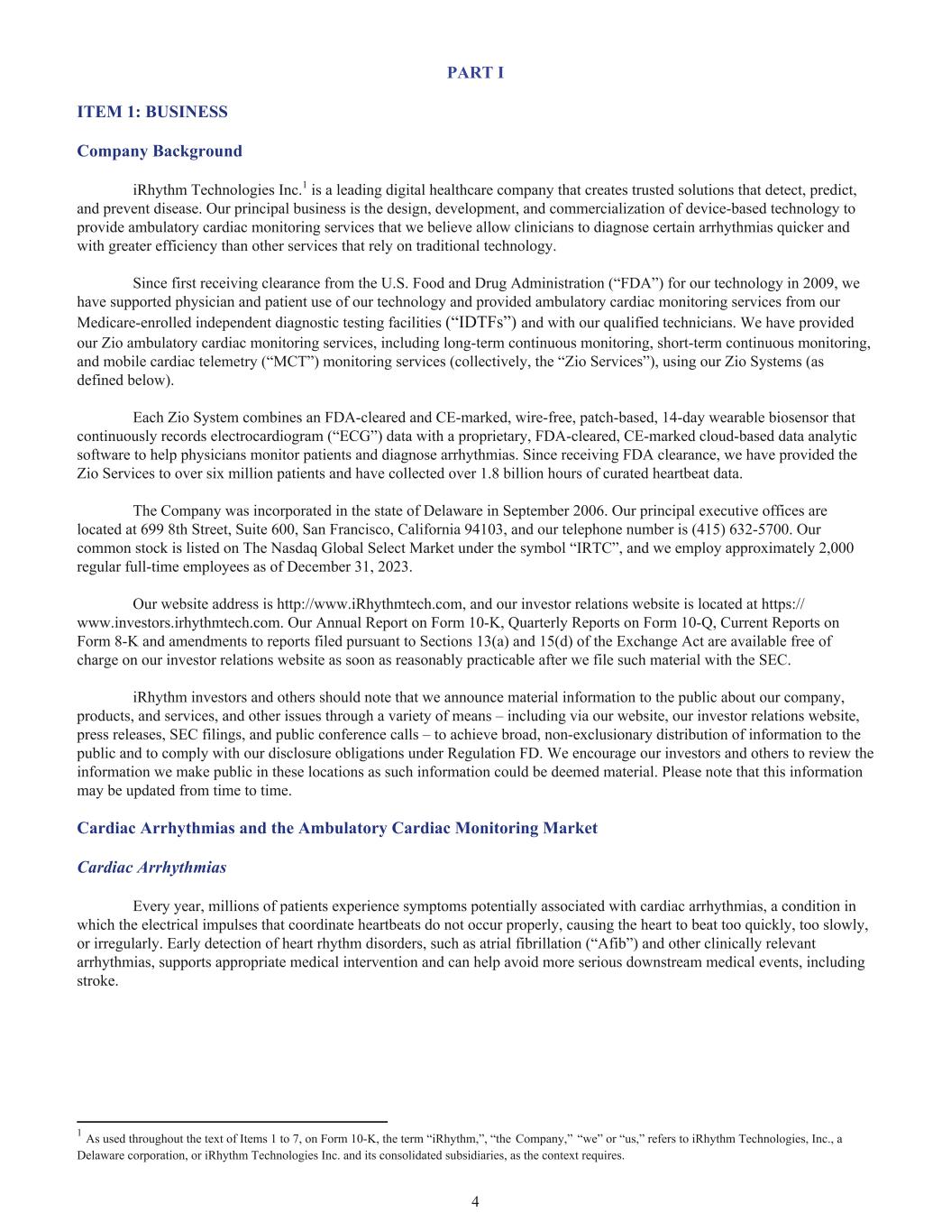 PART I ITEM 1: BUSINESS Company Background iRhythm Technologies Inc.1 is a leading digital healthcare company that creates trusted solutions that detect, predict, and prevent disease. Our principal business is the design, development, and commercialization of device-based technology to provide ambulatory cardiac monitoring services that we believe allow clinicians to diagnose certain arrhythmias quicker and with greater efficiency than other services that rely on traditional technology. Since first receiving clearance from the U.S. Food and Drug Administration (“FDA”) for our technology in 2009, we have supported physician and patient use of our technology and provided ambulatory cardiac monitoring services from our Medicare-enrolled independent diagnostic testing facilities (“IDTFs”) and with our qualified technicians. We have provided our Zio ambulatory cardiac monitoring services, including long-term continuous monitoring, short-term continuous monitoring, and mobile cardiac telemetry (“MCT”) monitoring services (collectively, the “Zio Services”), using our Zio Systems (as defined below). Each Zio System combines an FDA-cleared and CE-marked, wire-free, patch-based, 14-day wearable biosensor that continuously records electrocardiogram (“ECG”) data with a proprietary, FDA-cleared, CE-marked cloud-based data analytic software to help physicians monitor patients and diagnose arrhythmias. Since receiving FDA clearance, we have provided the Zio Services to over six million patients and have collected over 1.8 billion hours of curated heartbeat data. The Company was incorporated in the state of Delaware in September 2006. Our principal executive offices are located at 699 8th Street, Suite 600, San Francisco, California 94103, and our telephone number is (415) 632-5700. Our common stock is listed on The Nasdaq Global Select Market under the symbol “IRTC”, and we employ approximately 2,000 regular full-time employees as of December 31, 2023. Our website address is http://www.iRhythmtech.com, and our investor relations website is located at https:// www.investors.irhythmtech.com. Our Annual Report on Form 10-K, Quarterly Reports on Form 10-Q, Current Reports on Form 8-K and amendments to reports filed pursuant to Sections 13(a) and 15(d) of the Exchange Act are available free of charge on our investor relations website as soon as reasonably practicable after we file such material with the SEC. iRhythm investors and others should note that we announce material information to the public about our company, products, and services, and other issues through a variety of means – including via our website, our investor relations website, press releases, SEC filings, and public conference calls – to achieve broad, non-exclusionary distribution of information to the public and to comply with our disclosure obligations under Regulation FD. We encourage our investors and others to review the information we make public in these locations as such information could be deemed material. Please note that this information may be updated from time to time. Cardiac Arrhythmias and the Ambulatory Cardiac Monitoring Market Cardiac Arrhythmias Every year, millions of patients experience symptoms potentially associated with cardiac arrhythmias, a condition in which the electrical impulses that coordinate heartbeats do not occur properly, causing the heart to beat too quickly, too slowly, or irregularly. Early detection of heart rhythm disorders, such as atrial fibrillation (“Afib”) and other clinically relevant arrhythmias, supports appropriate medical intervention and can help avoid more serious downstream medical events, including stroke. 4 1 As used throughout the text of Items 1 to 7, on Form 10-K, the term “iRhythm,”, “the Company,” “we” or “us,” refers to iRhythm Technologies, Inc., a Delaware corporation, or iRhythm Technologies Inc. and its consolidated subsidiaries, as the context requires.
