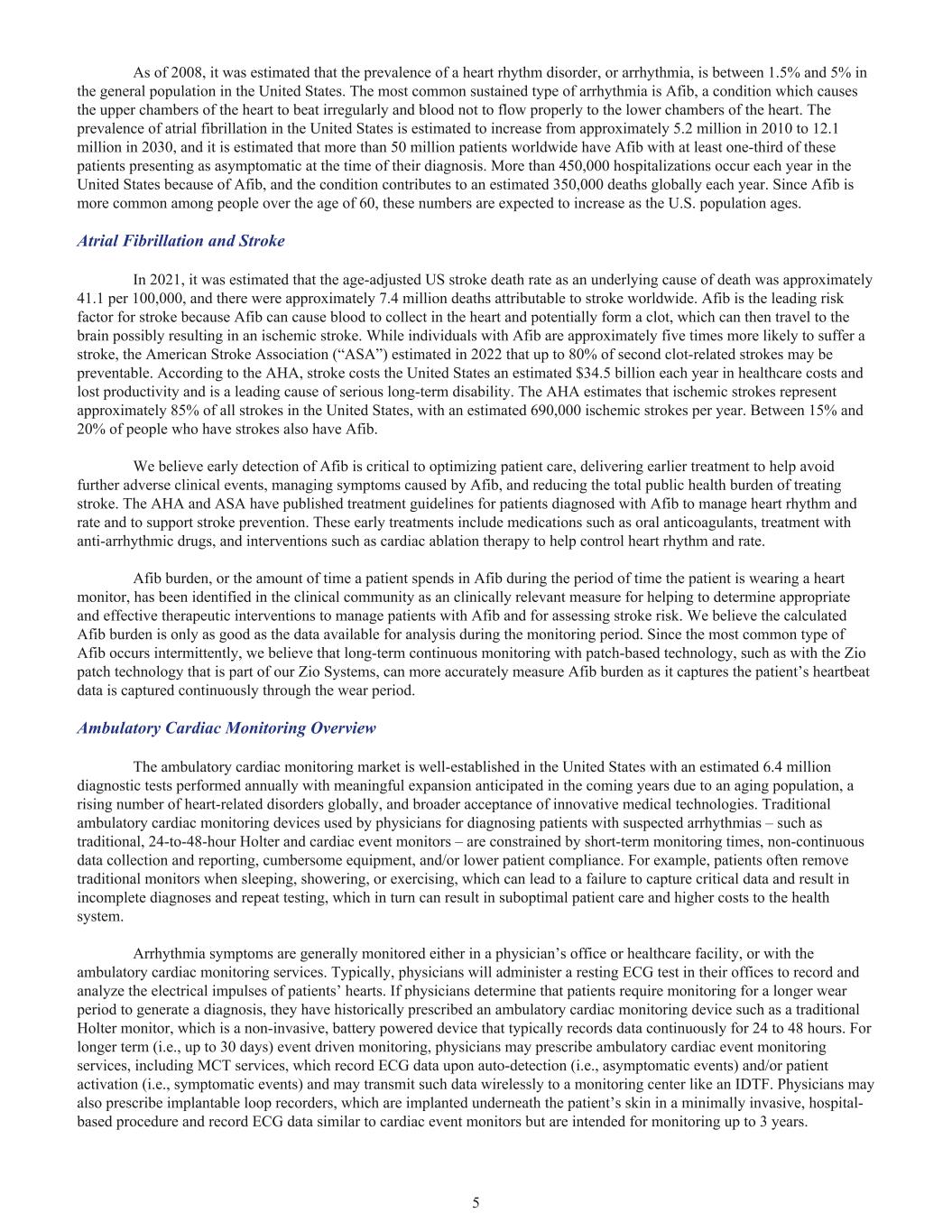 As of 2008, it was estimated that the prevalence of a heart rhythm disorder, or arrhythmia, is between 1.5% and 5% in the general population in the United States. The most common sustained type of arrhythmia is Afib, a condition which causes the upper chambers of the heart to beat irregularly and blood not to flow properly to the lower chambers of the heart. The prevalence of atrial fibrillation in the United States is estimated to increase from approximately 5.2 million in 2010 to 12.1 million in 2030, and it is estimated that more than 50 million patients worldwide have Afib with at least one-third of these patients presenting as asymptomatic at the time of their diagnosis. More than 450,000 hospitalizations occur each year in the United States because of Afib, and the condition contributes to an estimated 350,000 deaths globally each year. Since Afib is more common among people over the age of 60, these numbers are expected to increase as the U.S. population ages. Atrial Fibrillation and Stroke In 2021, it was estimated that the age-adjusted US stroke death rate as an underlying cause of death was approximately 41.1 per 100,000, and there were approximately 7.4 million deaths attributable to stroke worldwide. Afib is the leading risk factor for stroke because Afib can cause blood to collect in the heart and potentially form a clot, which can then travel to the brain possibly resulting in an ischemic stroke. While individuals with Afib are approximately five times more likely to suffer a stroke, the American Stroke Association (“ASA”) estimated in 2022 that up to 80% of second clot-related strokes may be preventable. According to the AHA, stroke costs the United States an estimated $34.5 billion each year in healthcare costs and lost productivity and is a leading cause of serious long-term disability. The AHA estimates that ischemic strokes represent approximately 85% of all strokes in the United States, with an estimated 690,000 ischemic strokes per year. Between 15% and 20% of people who have strokes also have Afib. We believe early detection of Afib is critical to optimizing patient care, delivering earlier treatment to help avoid further adverse clinical events, managing symptoms caused by Afib, and reducing the total public health burden of treating stroke. The AHA and ASA have published treatment guidelines for patients diagnosed with Afib to manage heart rhythm and rate and to support stroke prevention. These early treatments include medications such as oral anticoagulants, treatment with anti-arrhythmic drugs, and interventions such as cardiac ablation therapy to help control heart rhythm and rate. Afib burden, or the amount of time a patient spends in Afib during the period of time the patient is wearing a heart monitor, has been identified in the clinical community as an clinically relevant measure for helping to determine appropriate and effective therapeutic interventions to manage patients with Afib and for assessing stroke risk. We believe the calculated Afib burden is only as good as the data available for analysis during the monitoring period. Since the most common type of Afib occurs intermittently, we believe that long-term continuous monitoring with patch-based technology, such as with the Zio patch technology that is part of our Zio Systems, can more accurately measure Afib burden as it captures the patient’s heartbeat data is captured continuously through the wear period. Ambulatory Cardiac Monitoring Overview The ambulatory cardiac monitoring market is well-established in the United States with an estimated 6.4 million diagnostic tests performed annually with meaningful expansion anticipated in the coming years due to an aging population, a rising number of heart-related disorders globally, and broader acceptance of innovative medical technologies. Traditional ambulatory cardiac monitoring devices used by physicians for diagnosing patients with suspected arrhythmias – such as traditional, 24-to-48-hour Holter and cardiac event monitors – are constrained by short-term monitoring times, non-continuous data collection and reporting, cumbersome equipment, and/or lower patient compliance. For example, patients often remove traditional monitors when sleeping, showering, or exercising, which can lead to a failure to capture critical data and result in incomplete diagnoses and repeat testing, which in turn can result in suboptimal patient care and higher costs to the health system. Arrhythmia symptoms are generally monitored either in a physician’s office or healthcare facility, or with the ambulatory cardiac monitoring services. Typically, physicians will administer a resting ECG test in their offices to record and analyze the electrical impulses of patients’ hearts. If physicians determine that patients require monitoring for a longer wear period to generate a diagnosis, they have historically prescribed an ambulatory cardiac monitoring device such as a traditional Holter monitor, which is a non-invasive, battery powered device that typically records data continuously for 24 to 48 hours. For longer term (i.e., up to 30 days) event driven monitoring, physicians may prescribe ambulatory cardiac event monitoring services, including MCT services, which record ECG data upon auto-detection (i.e., asymptomatic events) and/or patient activation (i.e., symptomatic events) and may transmit such data wirelessly to a monitoring center like an IDTF. Physicians may also prescribe implantable loop recorders, which are implanted underneath the patient’s skin in a minimally invasive, hospital- based procedure and record ECG data similar to cardiac event monitors but are intended for monitoring up to 3 years. 5