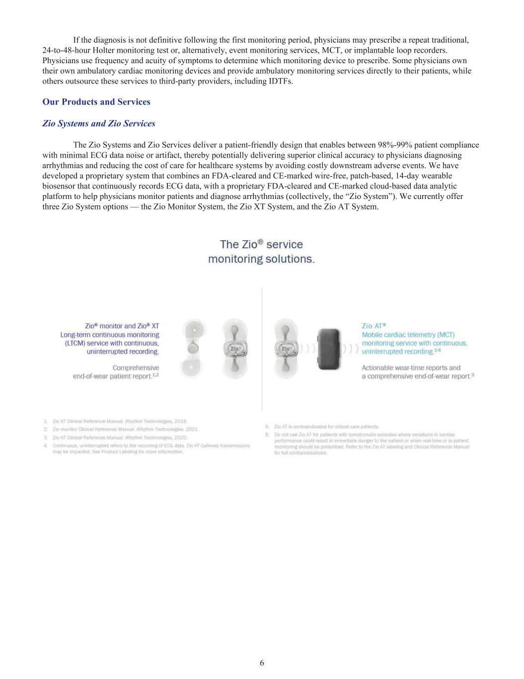 If the diagnosis is not definitive following the first monitoring period, physicians may prescribe a repeat traditional, 24-to-48-hour Holter monitoring test or, alternatively, event monitoring services, MCT, or implantable loop recorders. Physicians use frequency and acuity of symptoms to determine which monitoring device to prescribe. Some physicians own their own ambulatory cardiac monitoring devices and provide ambulatory monitoring services directly to their patients, while others outsource these services to third-party providers, including IDTFs. Our Products and Services Zio Systems and Zio Services The Zio Systems and Zio Services deliver a patient-friendly design that enables between 98%-99% patient compliance with minimal ECG data noise or artifact, thereby potentially delivering superior clinical accuracy to physicians diagnosing arrhythmias and reducing the cost of care for healthcare systems by avoiding costly downstream adverse events. We have developed a proprietary system that combines an FDA-cleared and CE-marked wire-free, patch-based, 14-day wearable biosensor that continuously records ECG data, with a proprietary FDA-cleared and CE-marked cloud-based data analytic platform to help physicians monitor patients and diagnose arrhythmias (collectively, the “Zio System”). We currently offer three Zio System options — the Zio Monitor System, the Zio XT System, and the Zio AT System. 6