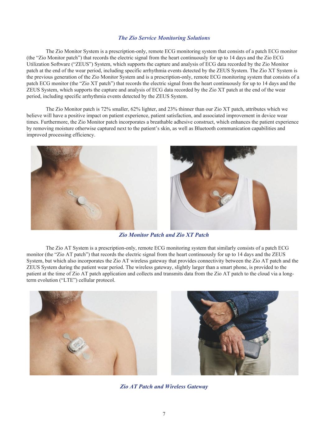 The Zio Service Monitoring Solutions The Zio Monitor System is a prescription-only, remote ECG monitoring system that consists of a patch ECG monitor (the “Zio Monitor patch”) that records the electric signal from the heart continuously for up to 14 days and the Zio ECG Utilization Software (“ZEUS”) System, which supports the capture and analysis of ECG data recorded by the Zio Monitor patch at the end of the wear period, including specific arrhythmia events detected by the ZEUS System. The Zio XT System is the previous generation of the Zio Monitor System and is a prescription-only, remote ECG monitoring system that consists of a patch ECG monitor (the “Zio XT patch”) that records the electric signal from the heart continuously for up to 14 days and the ZEUS System, which supports the capture and analysis of ECG data recorded by the Zio XT patch at the end of the wear period, including specific arrhythmia events detected by the ZEUS System. The Zio Monitor patch is 72% smaller, 62% lighter, and 23% thinner than our Zio XT patch, attributes which we believe will have a positive impact on patient experience, patient satisfaction, and associated improvement in device wear times. Furthermore, the Zio Monitor patch incorporates a breathable adhesive construct, which enhances the patient experience by removing moisture otherwise captured next to the patient’s skin, as well as Bluetooth communication capabilities and improved processing efficiency. Zio Monitor Patch and Zio XT Patch The Zio AT System is a prescription-only, remote ECG monitoring system that similarly consists of a patch ECG monitor (the “Zio AT patch”) that records the electric signal from the heart continuously for up to 14 days and the ZEUS System, but which also incorporates the Zio AT wireless gateway that provides connectivity between the Zio AT patch and the ZEUS System during the patient wear period. The wireless gateway, slightly larger than a smart phone, is provided to the patient at the time of Zio AT patch application and collects and transmits data from the Zio AT patch to the cloud via a long- term evolution (“LTE”) cellular protocol. Zio AT Patch and Wireless Gateway 7