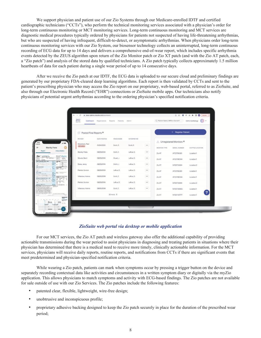 We support physician and patient use of our Zio Systems through our Medicare-enrolled IDTF and certified cardiographic technicians (“CCTs”), who perform the technical monitoring services associated with a physician’s order for long-term continuous monitoring or MCT monitoring services. Long-term continuous monitoring and MCT services are diagnostic medical procedures typically ordered by physicians for patients not suspected of having life-threatening arrhythmias, but who are suspected of having infrequent, difficult-to-detect, or asymptomatic arrhythmias. When physicians order long-term continuous monitoring services with our Zio System, our biosensor technology collects an uninterrupted, long-term continuous recording of ECG data for up to 14 days and delivers a comprehensive end-of-wear report, which includes specific arrhythmia events detected by the ZEUS algorithm upon return of the Zio Monitor patch or Zio XT patch (and with the Zio AT patch, each, a “Zio patch”) and analysis of the stored data by qualified technicians. A Zio patch typically collects approximately 1.5 million heartbeats of data for each patient during a single wear period of up to 14 consecutive days. After we receive the Zio patch at our IDTF, the ECG data is uploaded to our secure cloud and preliminary findings are generated by our proprietary FDA-cleared deep learning algorithms. Each report is then validated by CCTs and sent to the patient’s prescribing physician who may access the Zio report on our proprietary, web-based portal, referred to as ZioSuite, and also through our Electronic Health Record ("EHR") connections or ZioSuite mobile apps. Our technicians also notify physicians of potential urgent arrhythmias according to the ordering physician’s specified notification criteria. ZioSuite web portal via desktop or mobile application For our MCT services, the Zio AT patch and wireless gateway also offer the additional capability of providing actionable transmissions during the wear period to assist physicians in diagnosing and treating patients in situations where their physician has determined that there is a medical need to receive more timely, clinically actionable information. For the MCT services, physicians will receive daily reports, routine reports, and notifications from CCTs if there are significant events that meet predetermined and physician-specified notification criteria. While wearing a Zio patch, patients can mark when symptoms occur by pressing a trigger button on the device and separately recording contextual data like activities and circumstances in a written symptom diary or digitally via the myZio application. This allows physicians to match symptoms and activity with ECG-based findings. The Zio patches are not available for sale outside of use with our Zio Services. The Zio patches include the following features: • patented clear, flexible, lightweight, wire-free design; • unobtrusive and inconspicuous profile; • proprietary adhesive backing designed to keep the Zio patch securely in place for the duration of the prescribed wear period; 8