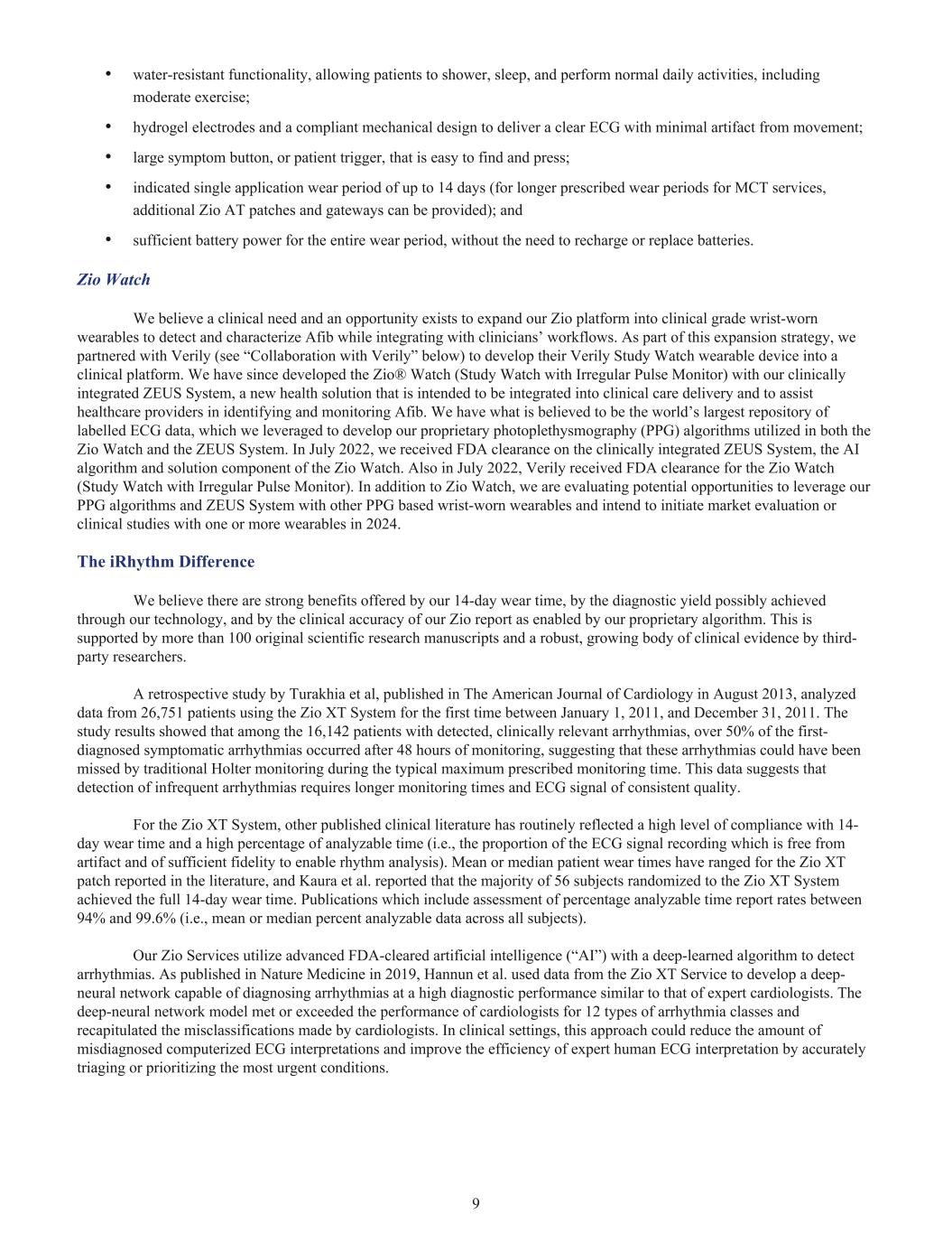 • water-resistant functionality, allowing patients to shower, sleep, and perform normal daily activities, including moderate exercise; • hydrogel electrodes and a compliant mechanical design to deliver a clear ECG with minimal artifact from movement; • large symptom button, or patient trigger, that is easy to find and press; • indicated single application wear period of up to 14 days (for longer prescribed wear periods for MCT services, additional Zio AT patches and gateways can be provided); and • sufficient battery power for the entire wear period, without the need to recharge or replace batteries. Zio Watch We believe a clinical need and an opportunity exists to expand our Zio platform into clinical grade wrist-worn wearables to detect and characterize Afib while integrating with clinicians’ workflows. As part of this expansion strategy, we partnered with Verily (see “Collaboration with Verily” below) to develop their Verily Study Watch wearable device into a clinical platform. We have since developed the Zio® Watch (Study Watch with Irregular Pulse Monitor) with our clinically integrated ZEUS System, a new health solution that is intended to be integrated into clinical care delivery and to assist healthcare providers in identifying and monitoring Afib. We have what is believed to be the world’s largest repository of labelled ECG data, which we leveraged to develop our proprietary photoplethysmography (PPG) algorithms utilized in both the Zio Watch and the ZEUS System. In July 2022, we received FDA clearance on the clinically integrated ZEUS System, the AI algorithm and solution component of the Zio Watch. Also in July 2022, Verily received FDA clearance for the Zio Watch (Study Watch with Irregular Pulse Monitor). In addition to Zio Watch, we are evaluating potential opportunities to leverage our PPG algorithms and ZEUS System with other PPG based wrist-worn wearables and intend to initiate market evaluation or clinical studies with one or more wearables in 2024. The iRhythm Difference We believe there are strong benefits offered by our 14-day wear time, by the diagnostic yield possibly achieved through our technology, and by the clinical accuracy of our Zio report as enabled by our proprietary algorithm. This is supported by more than 100 original scientific research manuscripts and a robust, growing body of clinical evidence by third- party researchers. A retrospective study by Turakhia et al, published in The American Journal of Cardiology in August 2013, analyzed data from 26,751 patients using the Zio XT System for the first time between January 1, 2011, and December 31, 2011. The study results showed that among the 16,142 patients with detected, clinically relevant arrhythmias, over 50% of the first- diagnosed symptomatic arrhythmias occurred after 48 hours of monitoring, suggesting that these arrhythmias could have been missed by traditional Holter monitoring during the typical maximum prescribed monitoring time. This data suggests that detection of infrequent arrhythmias requires longer monitoring times and ECG signal of consistent quality. For the Zio XT System, other published clinical literature has routinely reflected a high level of compliance with 14- day wear time and a high percentage of analyzable time (i.e., the proportion of the ECG signal recording which is free from artifact and of sufficient fidelity to enable rhythm analysis). Mean or median patient wear times have ranged for the Zio XT patch reported in the literature, and Kaura et al. reported that the majority of 56 subjects randomized to the Zio XT System achieved the full 14-day wear time. Publications which include assessment of percentage analyzable time report rates between 94% and 99.6% (i.e., mean or median percent analyzable data across all subjects). Our Zio Services utilize advanced FDA-cleared artificial intelligence (“AI”) with a deep-learned algorithm to detect arrhythmias. As published in Nature Medicine in 2019, Hannun et al. used data from the Zio XT Service to develop a deep- neural network capable of diagnosing arrhythmias at a high diagnostic performance similar to that of expert cardiologists. The deep-neural network model met or exceeded the performance of cardiologists for 12 types of arrhythmia classes and recapitulated the misclassifications made by cardiologists. In clinical settings, this approach could reduce the amount of misdiagnosed computerized ECG interpretations and improve the efficiency of expert human ECG interpretation by accurately triaging or prioritizing the most urgent conditions. 9