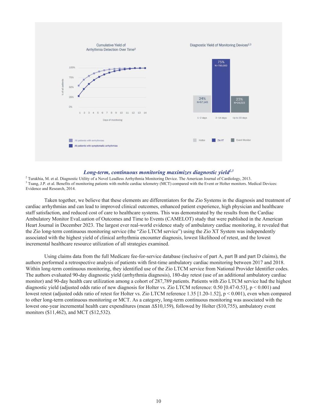 Long-term, continuous monitoring maximizes diagnostic yield2,3 2 Turakhia, M. et al. Diagnostic Utility of a Novel Leadless Arrhythmia Monitoring Device. The American Journal of Cardiology, 2013. 3 Tsang, J.P. et al. Benefits of monitoring patients with mobile cardiac telemetry (MCT) compared with the Event or Holter monitors. Medical Devices: Evidence and Research, 2014. Taken together, we believe that these elements are differentiators for the Zio Systems in the diagnosis and treatment of cardiac arrhythmias and can lead to improved clinical outcomes, enhanced patient experience, high physician and healthcare staff satisfaction, and reduced cost of care to healthcare systems. This was demonstrated by the results from the Cardiac Ambulatory Monitor EvaLuation of Outcomes and Time to Events (CAMELOT) study that were published in the American Heart Journal in December 2023. The largest ever real-world evidence study of ambulatory cardiac monitoring, it revealed that the Zio long-term continuous monitoring service (the “Zio LTCM service”) using the Zio XT System was independently associated with the highest yield of clinical arrhythmia encounter diagnosis, lowest likelihood of retest, and the lowest incremental healthcare resource utilization of all strategies examined. Using claims data from the full Medicare fee-for-service database (inclusive of part A, part B and part D claims), the authors performed a retrospective analysis of patients with first-time ambulatory cardiac monitoring between 2017 and 2018. Within long-term continuous monitoring, they identified use of the Zio LTCM service from National Provider Identifier codes. The authors evaluated 90-day diagnostic yield (arrhythmia diagnosis), 180-day retest (use of an additional ambulatory cardiac monitor) and 90-day health care utilization among a cohort of 287,789 patients. Patients with Zio LTCM service had the highest diagnostic yield (adjusted odds ratio of new diagnosis for Holter vs. Zio LTCM reference: 0.50 [0.47-0.53], p < 0.001) and lowest retest (adjusted odds ratio of retest for Holter vs. Zio LTCM reference 1.35 [1.20-1.52], p < 0.001), even when compared to other long-term continuous monitoring or MCT. As a category, long-term continuous monitoring was associated with the lowest one-year incremental health care expenditures (mean Δ$10,159), followed by Holter ($10,755), ambulatory event monitors ($11,462), and MCT ($12,532). 10