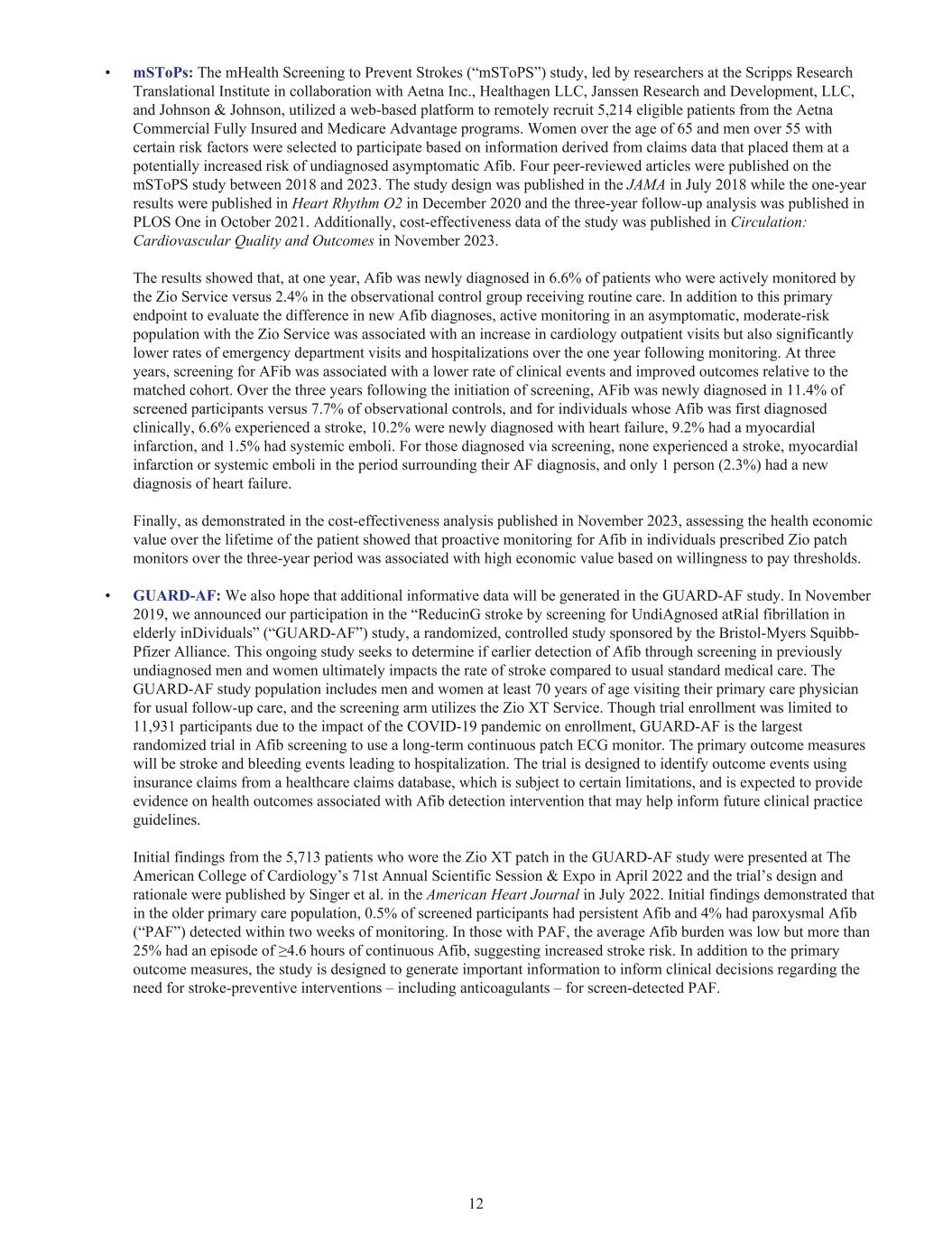 • mSToPs: The mHealth Screening to Prevent Strokes (“mSToPS”) study, led by researchers at the Scripps Research Translational Institute in collaboration with Aetna Inc., Healthagen LLC, Janssen Research and Development, LLC, and Johnson & Johnson, utilized a web-based platform to remotely recruit 5,214 eligible patients from the Aetna Commercial Fully Insured and Medicare Advantage programs. Women over the age of 65 and men over 55 with certain risk factors were selected to participate based on information derived from claims data that placed them at a potentially increased risk of undiagnosed asymptomatic Afib. Four peer-reviewed articles were published on the mSToPS study between 2018 and 2023. The study design was published in the JAMA in July 2018 while the one-year results were published in Heart Rhythm O2 in December 2020 and the three-year follow-up analysis was published in PLOS One in October 2021. Additionally, cost-effectiveness data of the study was published in Circulation: Cardiovascular Quality and Outcomes in November 2023. The results showed that, at one year, Afib was newly diagnosed in 6.6% of patients who were actively monitored by the Zio Service versus 2.4% in the observational control group receiving routine care. In addition to this primary endpoint to evaluate the difference in new Afib diagnoses, active monitoring in an asymptomatic, moderate-risk population with the Zio Service was associated with an increase in cardiology outpatient visits but also significantly lower rates of emergency department visits and hospitalizations over the one year following monitoring. At three years, screening for AFib was associated with a lower rate of clinical events and improved outcomes relative to the matched cohort. Over the three years following the initiation of screening, AFib was newly diagnosed in 11.4% of screened participants versus 7.7% of observational controls, and for individuals whose Afib was first diagnosed clinically, 6.6% experienced a stroke, 10.2% were newly diagnosed with heart failure, 9.2% had a myocardial infarction, and 1.5% had systemic emboli. For those diagnosed via screening, none experienced a stroke, myocardial infarction or systemic emboli in the period surrounding their AF diagnosis, and only 1 person (2.3%) had a new diagnosis of heart failure. Finally, as demonstrated in the cost-effectiveness analysis published in November 2023, assessing the health economic value over the lifetime of the patient showed that proactive monitoring for Afib in individuals prescribed Zio patch monitors over the three-year period was associated with high economic value based on willingness to pay thresholds. • GUARD-AF: We also hope that additional informative data will be generated in the GUARD-AF study. In November 2019, we announced our participation in the “ReducinG stroke by screening for UndiAgnosed atRial fibrillation in elderly inDividuals” (“GUARD-AF”) study, a randomized, controlled study sponsored by the Bristol-Myers Squibb- Pfizer Alliance. This ongoing study seeks to determine if earlier detection of Afib through screening in previously undiagnosed men and women ultimately impacts the rate of stroke compared to usual standard medical care. The GUARD-AF study population includes men and women at least 70 years of age visiting their primary care physician for usual follow-up care, and the screening arm utilizes the Zio XT Service. Though trial enrollment was limited to 11,931 participants due to the impact of the COVID-19 pandemic on enrollment, GUARD-AF is the largest randomized trial in Afib screening to use a long-term continuous patch ECG monitor. The primary outcome measures will be stroke and bleeding events leading to hospitalization. The trial is designed to identify outcome events using insurance claims from a healthcare claims database, which is subject to certain limitations, and is expected to provide evidence on health outcomes associated with Afib detection intervention that may help inform future clinical practice guidelines. Initial findings from the 5,713 patients who wore the Zio XT patch in the GUARD-AF study were presented at The American College of Cardiology’s 71st Annual Scientific Session & Expo in April 2022 and the trial’s design and rationale were published by Singer et al. in the American Heart Journal in July 2022. Initial findings demonstrated that in the older primary care population, 0.5% of screened participants had persistent Afib and 4% had paroxysmal Afib (“PAF”) detected within two weeks of monitoring. In those with PAF, the average Afib burden was low but more than 25% had an episode of ≥4.6 hours of continuous Afib, suggesting increased stroke risk. In addition to the primary outcome measures, the study is designed to generate important information to inform clinical decisions regarding the need for stroke-preventive interventions – including anticoagulants – for screen-detected PAF. 12