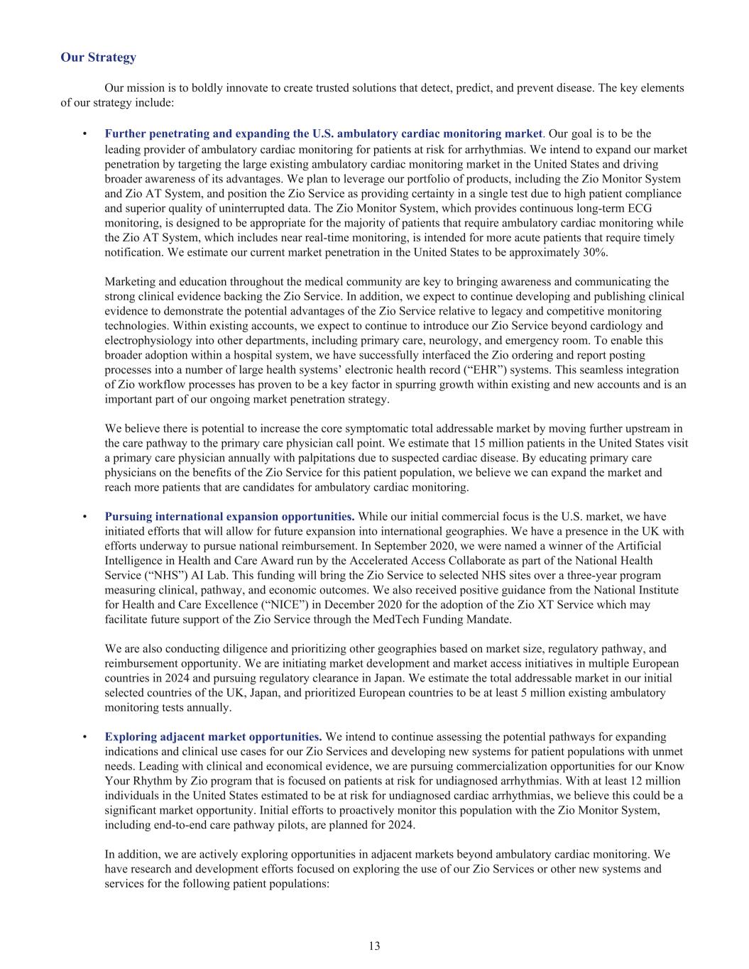 Our Strategy Our mission is to boldly innovate to create trusted solutions that detect, predict, and prevent disease. The key elements of our strategy include: • Further penetrating and expanding the U.S. ambulatory cardiac monitoring market. Our goal is to be the leading provider of ambulatory cardiac monitoring for patients at risk for arrhythmias. We intend to expand our market penetration by targeting the large existing ambulatory cardiac monitoring market in the United States and driving broader awareness of its advantages. We plan to leverage our portfolio of products, including the Zio Monitor System and Zio AT System, and position the Zio Service as providing certainty in a single test due to high patient compliance and superior quality of uninterrupted data. The Zio Monitor System, which provides continuous long-term ECG monitoring, is designed to be appropriate for the majority of patients that require ambulatory cardiac monitoring while the Zio AT System, which includes near real-time monitoring, is intended for more acute patients that require timely notification. We estimate our current market penetration in the United States to be approximately 30%. Marketing and education throughout the medical community are key to bringing awareness and communicating the strong clinical evidence backing the Zio Service. In addition, we expect to continue developing and publishing clinical evidence to demonstrate the potential advantages of the Zio Service relative to legacy and competitive monitoring technologies. Within existing accounts, we expect to continue to introduce our Zio Service beyond cardiology and electrophysiology into other departments, including primary care, neurology, and emergency room. To enable this broader adoption within a hospital system, we have successfully interfaced the Zio ordering and report posting processes into a number of large health systems’ electronic health record (“EHR”) systems. This seamless integration of Zio workflow processes has proven to be a key factor in spurring growth within existing and new accounts and is an important part of our ongoing market penetration strategy. We believe there is potential to increase the core symptomatic total addressable market by moving further upstream in the care pathway to the primary care physician call point. We estimate that 15 million patients in the United States visit a primary care physician annually with palpitations due to suspected cardiac disease. By educating primary care physicians on the benefits of the Zio Service for this patient population, we believe we can expand the market and reach more patients that are candidates for ambulatory cardiac monitoring. • Pursuing international expansion opportunities. While our initial commercial focus is the U.S. market, we have initiated efforts that will allow for future expansion into international geographies. We have a presence in the UK with efforts underway to pursue national reimbursement. In September 2020, we were named a winner of the Artificial Intelligence in Health and Care Award run by the Accelerated Access Collaborate as part of the National Health Service (“NHS”) AI Lab. This funding will bring the Zio Service to selected NHS sites over a three-year program measuring clinical, pathway, and economic outcomes. We also received positive guidance from the National Institute for Health and Care Excellence (“NICE”) in December 2020 for the adoption of the Zio XT Service which may facilitate future support of the Zio Service through the MedTech Funding Mandate. We are also conducting diligence and prioritizing other geographies based on market size, regulatory pathway, and reimbursement opportunity. We are initiating market development and market access initiatives in multiple European countries in 2024 and pursuing regulatory clearance in Japan. We estimate the total addressable market in our initial selected countries of the UK, Japan, and prioritized European countries to be at least 5 million existing ambulatory monitoring tests annually. • Exploring adjacent market opportunities. We intend to continue assessing the potential pathways for expanding indications and clinical use cases for our Zio Services and developing new systems for patient populations with unmet needs. Leading with clinical and economical evidence, we are pursuing commercialization opportunities for our Know Your Rhythm by Zio program that is focused on patients at risk for undiagnosed arrhythmias. With at least 12 million individuals in the United States estimated to be at risk for undiagnosed cardiac arrhythmias, we believe this could be a significant market opportunity. Initial efforts to proactively monitor this population with the Zio Monitor System, including end-to-end care pathway pilots, are planned for 2024. In addition, we are actively exploring opportunities in adjacent markets beyond ambulatory cardiac monitoring. We have research and development efforts focused on exploring the use of our Zio Services or other new systems and services for the following patient populations: 13