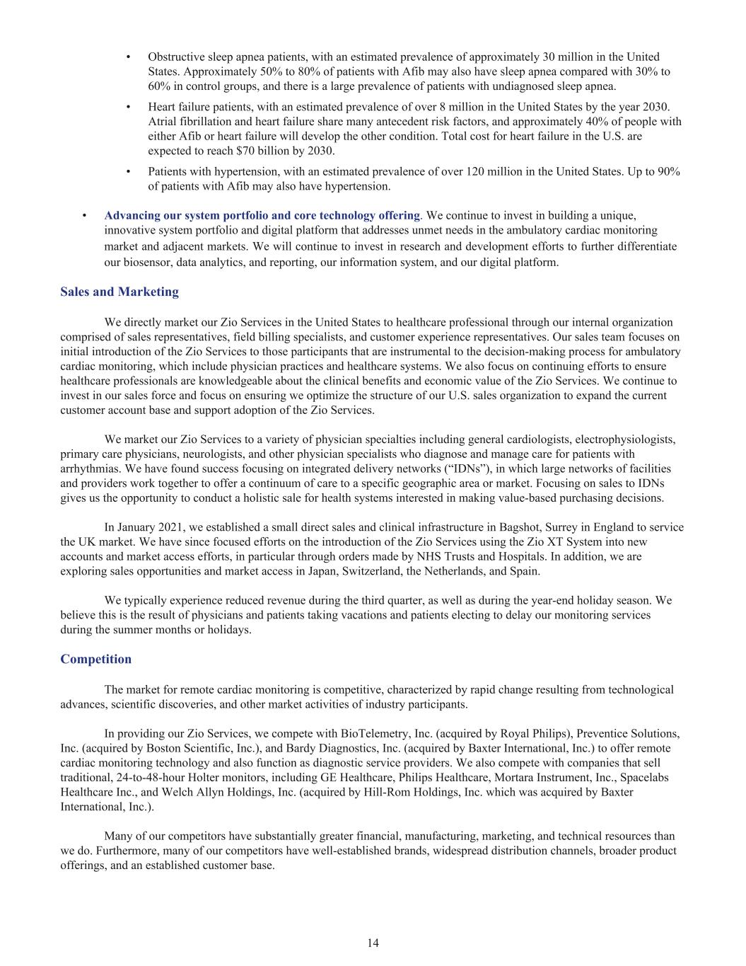 • Obstructive sleep apnea patients, with an estimated prevalence of approximately 30 million in the United States. Approximately 50% to 80% of patients with Afib may also have sleep apnea compared with 30% to 60% in control groups, and there is a large prevalence of patients with undiagnosed sleep apnea. • Heart failure patients, with an estimated prevalence of over 8 million in the United States by the year 2030. Atrial fibrillation and heart failure share many antecedent risk factors, and approximately 40% of people with either Afib or heart failure will develop the other condition. Total cost for heart failure in the U.S. are expected to reach $70 billion by 2030. • Patients with hypertension, with an estimated prevalence of over 120 million in the United States. Up to 90% of patients with Afib may also have hypertension. • Advancing our system portfolio and core technology offering. We continue to invest in building a unique, innovative system portfolio and digital platform that addresses unmet needs in the ambulatory cardiac monitoring market and adjacent markets. We will continue to invest in research and development efforts to further differentiate our biosensor, data analytics, and reporting, our information system, and our digital platform. Sales and Marketing We directly market our Zio Services in the United States to healthcare professional through our internal organization comprised of sales representatives, field billing specialists, and customer experience representatives. Our sales team focuses on initial introduction of the Zio Services to those participants that are instrumental to the decision-making process for ambulatory cardiac monitoring, which include physician practices and healthcare systems. We also focus on continuing efforts to ensure healthcare professionals are knowledgeable about the clinical benefits and economic value of the Zio Services. We continue to invest in our sales force and focus on ensuring we optimize the structure of our U.S. sales organization to expand the current customer account base and support adoption of the Zio Services. We market our Zio Services to a variety of physician specialties including general cardiologists, electrophysiologists, primary care physicians, neurologists, and other physician specialists who diagnose and manage care for patients with arrhythmias. We have found success focusing on integrated delivery networks (“IDNs”), in which large networks of facilities and providers work together to offer a continuum of care to a specific geographic area or market. Focusing on sales to IDNs gives us the opportunity to conduct a holistic sale for health systems interested in making value-based purchasing decisions. In January 2021, we established a small direct sales and clinical infrastructure in Bagshot, Surrey in England to service the UK market. We have since focused efforts on the introduction of the Zio Services using the Zio XT System into new accounts and market access efforts, in particular through orders made by NHS Trusts and Hospitals. In addition, we are exploring sales opportunities and market access in Japan, Switzerland, the Netherlands, and Spain. We typically experience reduced revenue during the third quarter, as well as during the year-end holiday season. We believe this is the result of physicians and patients taking vacations and patients electing to delay our monitoring services during the summer months or holidays. Competition The market for remote cardiac monitoring is competitive, characterized by rapid change resulting from technological advances, scientific discoveries, and other market activities of industry participants. In providing our Zio Services, we compete with BioTelemetry, Inc. (acquired by Royal Philips), Preventice Solutions, Inc. (acquired by Boston Scientific, Inc.), and Bardy Diagnostics, Inc. (acquired by Baxter International, Inc.) to offer remote cardiac monitoring technology and also function as diagnostic service providers. We also compete with companies that sell traditional, 24-to-48-hour Holter monitors, including GE Healthcare, Philips Healthcare, Mortara Instrument, Inc., Spacelabs Healthcare Inc., and Welch Allyn Holdings, Inc. (acquired by Hill-Rom Holdings, Inc. which was acquired by Baxter International, Inc.). Many of our competitors have substantially greater financial, manufacturing, marketing, and technical resources than we do. Furthermore, many of our competitors have well-established brands, widespread distribution channels, broader product offerings, and an established customer base. 14