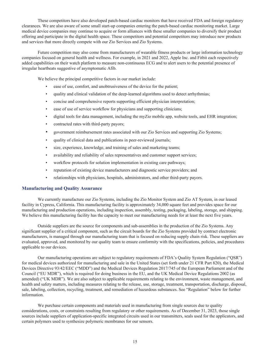 These competitors have also developed patch-based cardiac monitors that have received FDA and foreign regulatory clearances. We are also aware of some small start-up companies entering the patch-based cardiac monitoring market. Large medical device companies may continue to acquire or form alliances with these smaller companies to diversify their product offering and participate in the digital health space. These competitors and potential competitors may introduce new products and services that more directly compete with our Zio Services and Zio Systems. Future competition may also come from manufacturers of wearable fitness products or large information technology companies focused on general health and wellness. For example, in 2021 and 2022, Apple Inc. and Fitbit each respectively added capabilities on their watch platform to measure non-continuous ECG and to alert users to the potential presence of irregular heartbeats suggestive of asymptomatic Afib. We believe the principal competitive factors in our market include: • ease of use, comfort, and unobtrusiveness of the device for the patient; • quality and clinical validation of the deep-learned algorithms used to detect arrhythmias; • concise and comprehensive reports supporting efficient physician interpretation; • ease of use of service workflow for physicians and supporting clinicians; • digital tools for data management, including the myZio mobile app, website tools, and EHR integration; • contracted rates with third-party payors; • government reimbursement rates associated with our Zio Services and supporting Zio Systems; • quality of clinical data and publications in peer-reviewed journals; • size, experience, knowledge, and training of sales and marketing teams; • availability and reliability of sales representatives and customer support services; • workflow protocols for solution implementation in existing care pathways; • reputation of existing device manufacturers and diagnostic service providers; and • relationships with physicians, hospitals, administrators, and other third-party payors. Manufacturing and Quality Assurance We currently manufacture our Zio Systems, including the Zio Monitor System and Zio AT System, in our leased facility in Cypress, California. This manufacturing facility is approximately 34,000 square feet and provides space for our manufacturing and production operations, including inspection, assembly, testing, packaging, labeling, storage, and shipping. We believe this manufacturing facility has the capacity to meet our manufacturing needs for at least the next five years. Outside suppliers are the source for components and sub-assemblies in the production of the Zio Systems. Any significant supplier of a critical component, such as the circuit boards for the Zio Systems provided by contract electronic manufacturers, is managed through our manufacturing team that is focused on reducing supply chain risk. These suppliers are evaluated, approved, and monitored by our quality team to ensure conformity with the specifications, policies, and procedures applicable to our devices. Our manufacturing operations are subject to regulatory requirements of FDA’s Quality System Regulation (“QSR”) for medical devices authorized for manufacturing and sale in the United States (set forth under 21 CFR Part 820), the Medical Devices Directive 93/42/EEC (“MDD”) and the Medical Devices Regulation 2017/745 of the European Parliament and of the Council (“EU MDR”), which is required for doing business in the EU, and the UK Medical Device Regulations 2002 (as amended) (“UK MDR”). We are also subject to applicable requirements relating to the environment, waste management, and health and safety matters, including measures relating to the release, use, storage, treatment, transportation, discharge, disposal, sale, labeling, collection, recycling, treatment, and remediation of hazardous substances. See “Regulation” below for further information. We purchase certain components and materials used in manufacturing from single sources due to quality considerations, costs, or constraints resulting from regulatory or other requirements. As of December 31, 2023, those single sources include suppliers of application-specific integrated circuits used in our transmitters, seals used for the applicators, and certain polymers used to synthesize polymeric membranes for our sensors. 15
