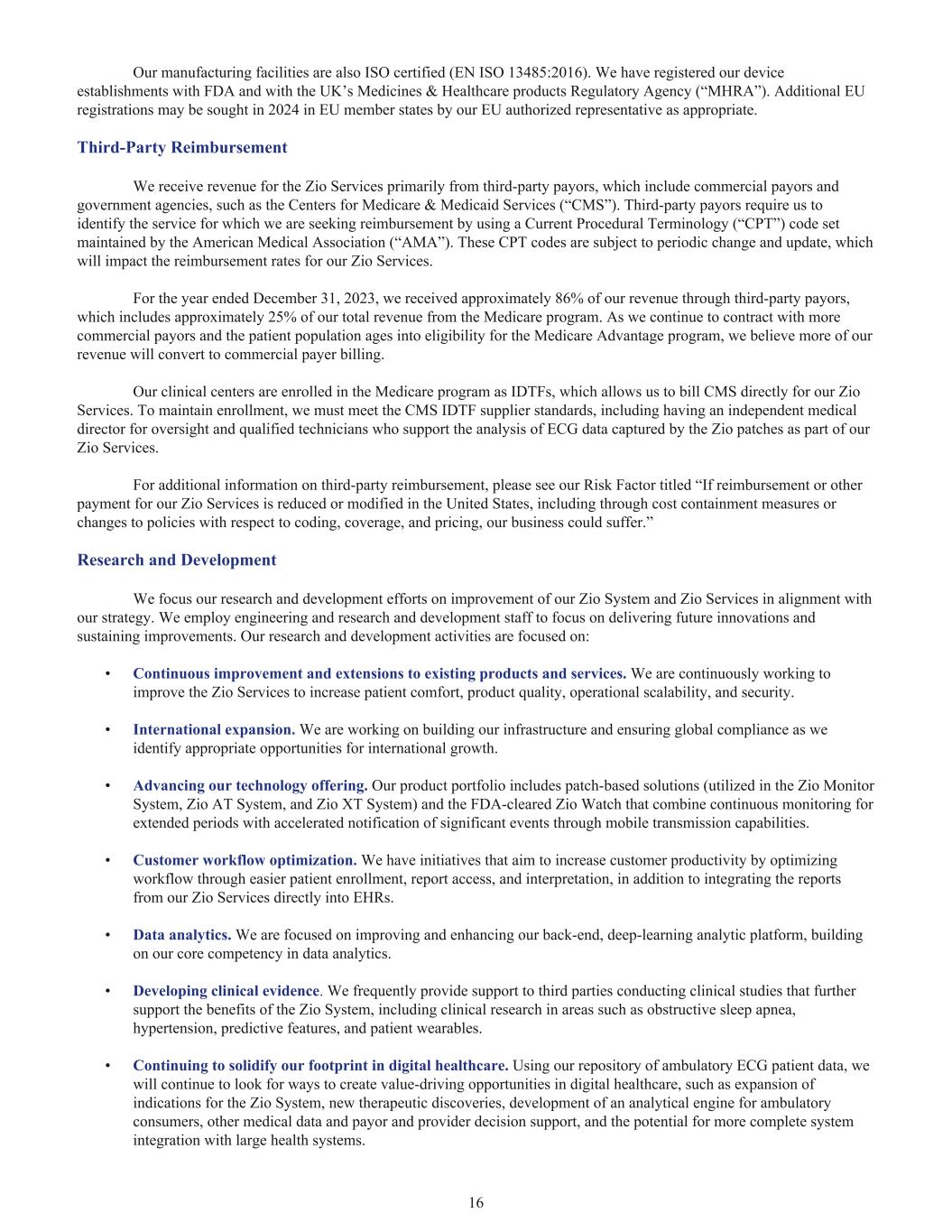 Our manufacturing facilities are also ISO certified (EN ISO 13485:2016). We have registered our device establishments with FDA and with the UK’s Medicines & Healthcare products Regulatory Agency (“MHRA”). Additional EU registrations may be sought in 2024 in EU member states by our EU authorized representative as appropriate. Third-Party Reimbursement We receive revenue for the Zio Services primarily from third-party payors, which include commercial payors and government agencies, such as the Centers for Medicare & Medicaid Services (“CMS”). Third-party payors require us to identify the service for which we are seeking reimbursement by using a Current Procedural Terminology (“CPT”) code set maintained by the American Medical Association (“AMA”). These CPT codes are subject to periodic change and update, which will impact the reimbursement rates for our Zio Services. For the year ended December 31, 2023, we received approximately 86% of our revenue through third-party payors, which includes approximately 25% of our total revenue from the Medicare program. As we continue to contract with more commercial payors and the patient population ages into eligibility for the Medicare Advantage program, we believe more of our revenue will convert to commercial payer billing. Our clinical centers are enrolled in the Medicare program as IDTFs, which allows us to bill CMS directly for our Zio Services. To maintain enrollment, we must meet the CMS IDTF supplier standards, including having an independent medical director for oversight and qualified technicians who support the analysis of ECG data captured by the Zio patches as part of our Zio Services. For additional information on third-party reimbursement, please see our Risk Factor titled “If reimbursement or other payment for our Zio Services is reduced or modified in the United States, including through cost containment measures or changes to policies with respect to coding, coverage, and pricing, our business could suffer.” Research and Development We focus our research and development efforts on improvement of our Zio System and Zio Services in alignment with our strategy. We employ engineering and research and development staff to focus on delivering future innovations and sustaining improvements. Our research and development activities are focused on: • Continuous improvement and extensions to existing products and services. We are continuously working to improve the Zio Services to increase patient comfort, product quality, operational scalability, and security. • International expansion. We are working on building our infrastructure and ensuring global compliance as we identify appropriate opportunities for international growth. • Advancing our technology offering. Our product portfolio includes patch-based solutions (utilized in the Zio Monitor System, Zio AT System, and Zio XT System) and the FDA-cleared Zio Watch that combine continuous monitoring for extended periods with accelerated notification of significant events through mobile transmission capabilities. • Customer workflow optimization. We have initiatives that aim to increase customer productivity by optimizing workflow through easier patient enrollment, report access, and interpretation, in addition to integrating the reports from our Zio Services directly into EHRs. • Data analytics. We are focused on improving and enhancing our back-end, deep-learning analytic platform, building on our core competency in data analytics. • Developing clinical evidence. We frequently provide support to third parties conducting clinical studies that further support the benefits of the Zio System, including clinical research in areas such as obstructive sleep apnea, hypertension, predictive features, and patient wearables. • Continuing to solidify our footprint in digital healthcare. Using our repository of ambulatory ECG patient data, we will continue to look for ways to create value-driving opportunities in digital healthcare, such as expansion of indications for the Zio System, new therapeutic discoveries, development of an analytical engine for ambulatory consumers, other medical data and payor and provider decision support, and the potential for more complete system integration with large health systems. 16