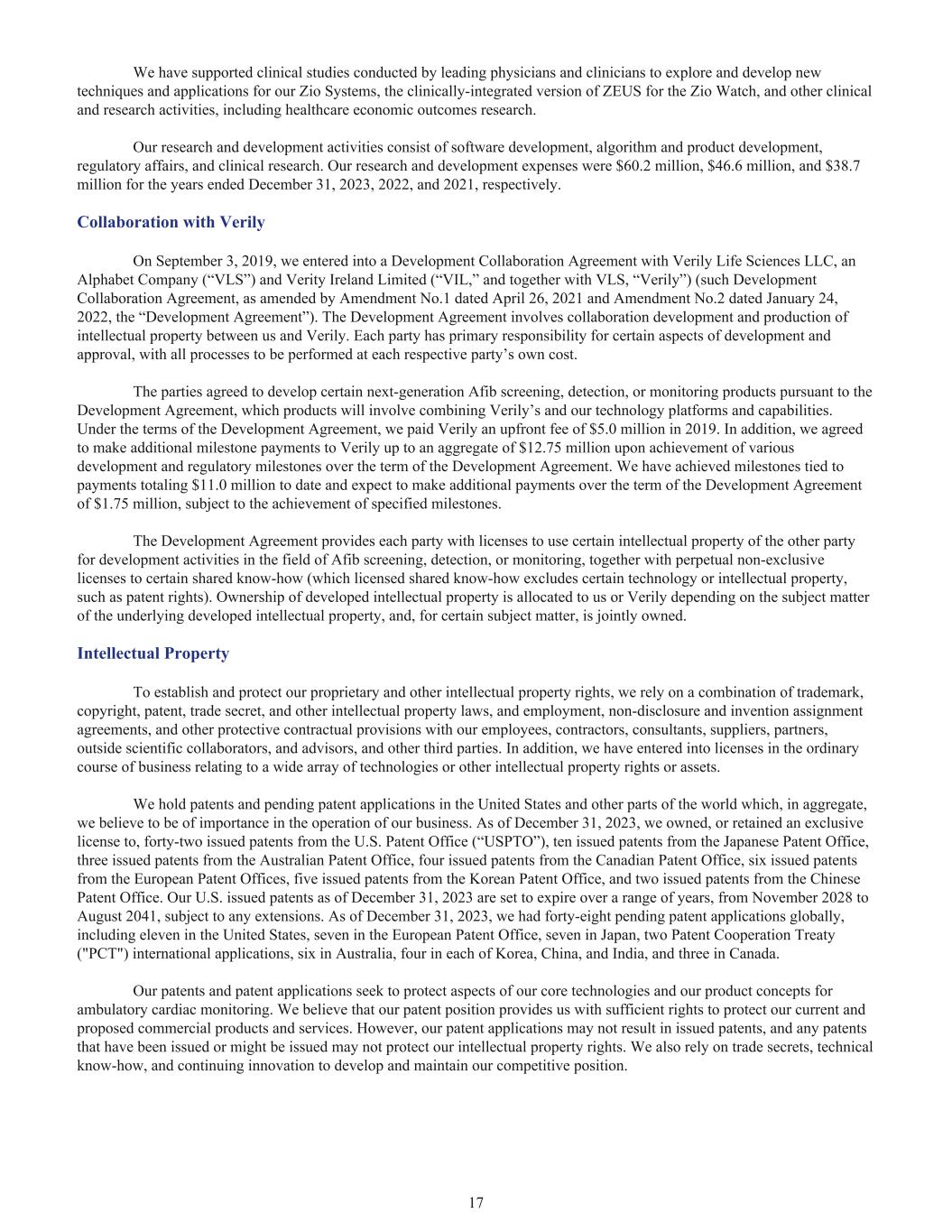 We have supported clinical studies conducted by leading physicians and clinicians to explore and develop new techniques and applications for our Zio Systems, the clinically-integrated version of ZEUS for the Zio Watch, and other clinical and research activities, including healthcare economic outcomes research. Our research and development activities consist of software development, algorithm and product development, regulatory affairs, and clinical research. Our research and development expenses were $60.2 million, $46.6 million, and $38.7 million for the years ended December 31, 2023, 2022, and 2021, respectively. Collaboration with Verily On September 3, 2019, we entered into a Development Collaboration Agreement with Verily Life Sciences LLC, an Alphabet Company (“VLS”) and Verity Ireland Limited (“VIL,” and together with VLS, “Verily”) (such Development Collaboration Agreement, as amended by Amendment No.1 dated April 26, 2021 and Amendment No.2 dated January 24, 2022, the “Development Agreement”). The Development Agreement involves collaboration development and production of intellectual property between us and Verily. Each party has primary responsibility for certain aspects of development and approval, with all processes to be performed at each respective party’s own cost. The parties agreed to develop certain next-generation Afib screening, detection, or monitoring products pursuant to the Development Agreement, which products will involve combining Verily’s and our technology platforms and capabilities. Under the terms of the Development Agreement, we paid Verily an upfront fee of $5.0 million in 2019. In addition, we agreed to make additional milestone payments to Verily up to an aggregate of $12.75 million upon achievement of various development and regulatory milestones over the term of the Development Agreement. We have achieved milestones tied to payments totaling $11.0 million to date and expect to make additional payments over the term of the Development Agreement of $1.75 million, subject to the achievement of specified milestones. The Development Agreement provides each party with licenses to use certain intellectual property of the other party for development activities in the field of Afib screening, detection, or monitoring, together with perpetual non-exclusive licenses to certain shared know-how (which licensed shared know-how excludes certain technology or intellectual property, such as patent rights). Ownership of developed intellectual property is allocated to us or Verily depending on the subject matter of the underlying developed intellectual property, and, for certain subject matter, is jointly owned. Intellectual Property To establish and protect our proprietary and other intellectual property rights, we rely on a combination of trademark, copyright, patent, trade secret, and other intellectual property laws, and employment, non-disclosure and invention assignment agreements, and other protective contractual provisions with our employees, contractors, consultants, suppliers, partners, outside scientific collaborators, and advisors, and other third parties. In addition, we have entered into licenses in the ordinary course of business relating to a wide array of technologies or other intellectual property rights or assets. We hold patents and pending patent applications in the United States and other parts of the world which, in aggregate, we believe to be of importance in the operation of our business. As of December 31, 2023, we owned, or retained an exclusive license to, forty-two issued patents from the U.S. Patent Office (“USPTO”), ten issued patents from the Japanese Patent Office, three issued patents from the Australian Patent Office, four issued patents from the Canadian Patent Office, six issued patents from the European Patent Offices, five issued patents from the Korean Patent Office, and two issued patents from the Chinese Patent Office. Our U.S. issued patents as of December 31, 2023 are set to expire over a range of years, from November 2028 to August 2041, subject to any extensions. As of December 31, 2023, we had forty-eight pending patent applications globally, including eleven in the United States, seven in the European Patent Office, seven in Japan, two Patent Cooperation Treaty ("PCT") international applications, six in Australia, four in each of Korea, China, and India, and three in Canada. Our patents and patent applications seek to protect aspects of our core technologies and our product concepts for ambulatory cardiac monitoring. We believe that our patent position provides us with sufficient rights to protect our current and proposed commercial products and services. However, our patent applications may not result in issued patents, and any patents that have been issued or might be issued may not protect our intellectual property rights. We also rely on trade secrets, technical know-how, and continuing innovation to develop and maintain our competitive position. 17